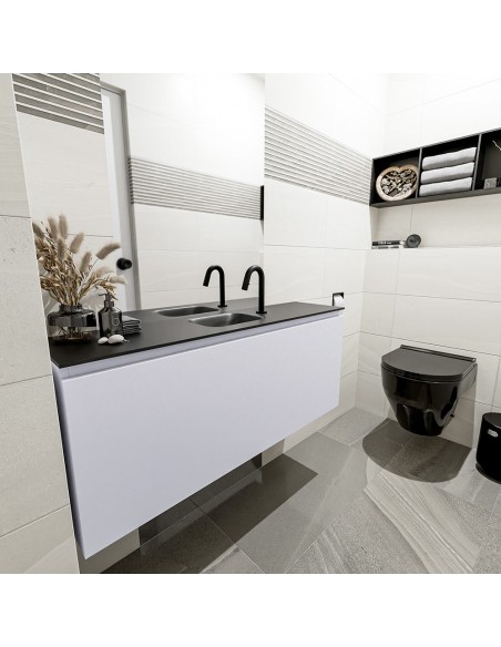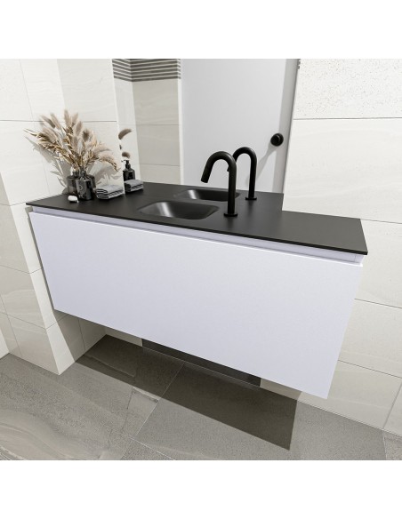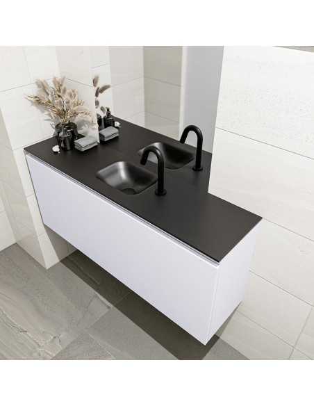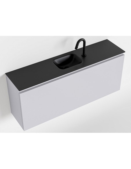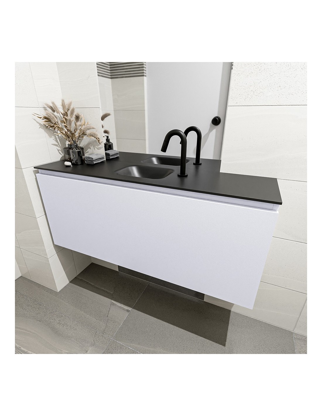 OLAN Komplet badmiljø med midt centreret håndvask til bordmonteret armatur. Badmiljøet kommer med 1 skuffe med fuldt udtræk, og er fremstillet i MDF. Håndvasken er fremstillet i sort solid surface. Badmiljøet måler 120 cm i bredden. Det viste armatur medfølger ikke i sættet.