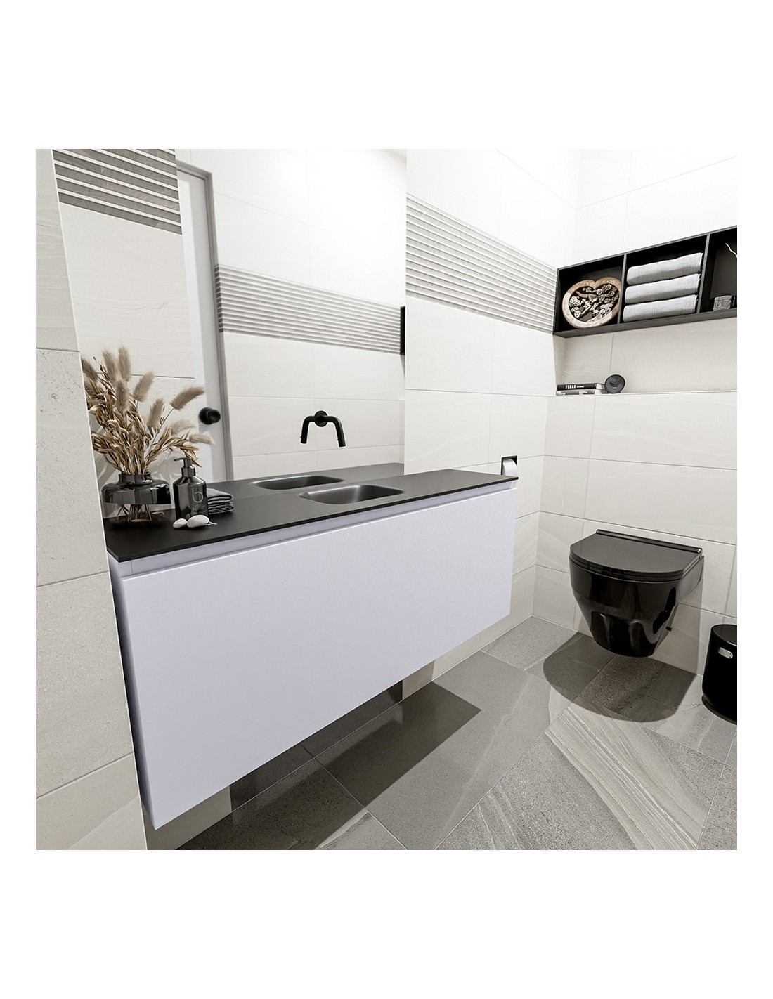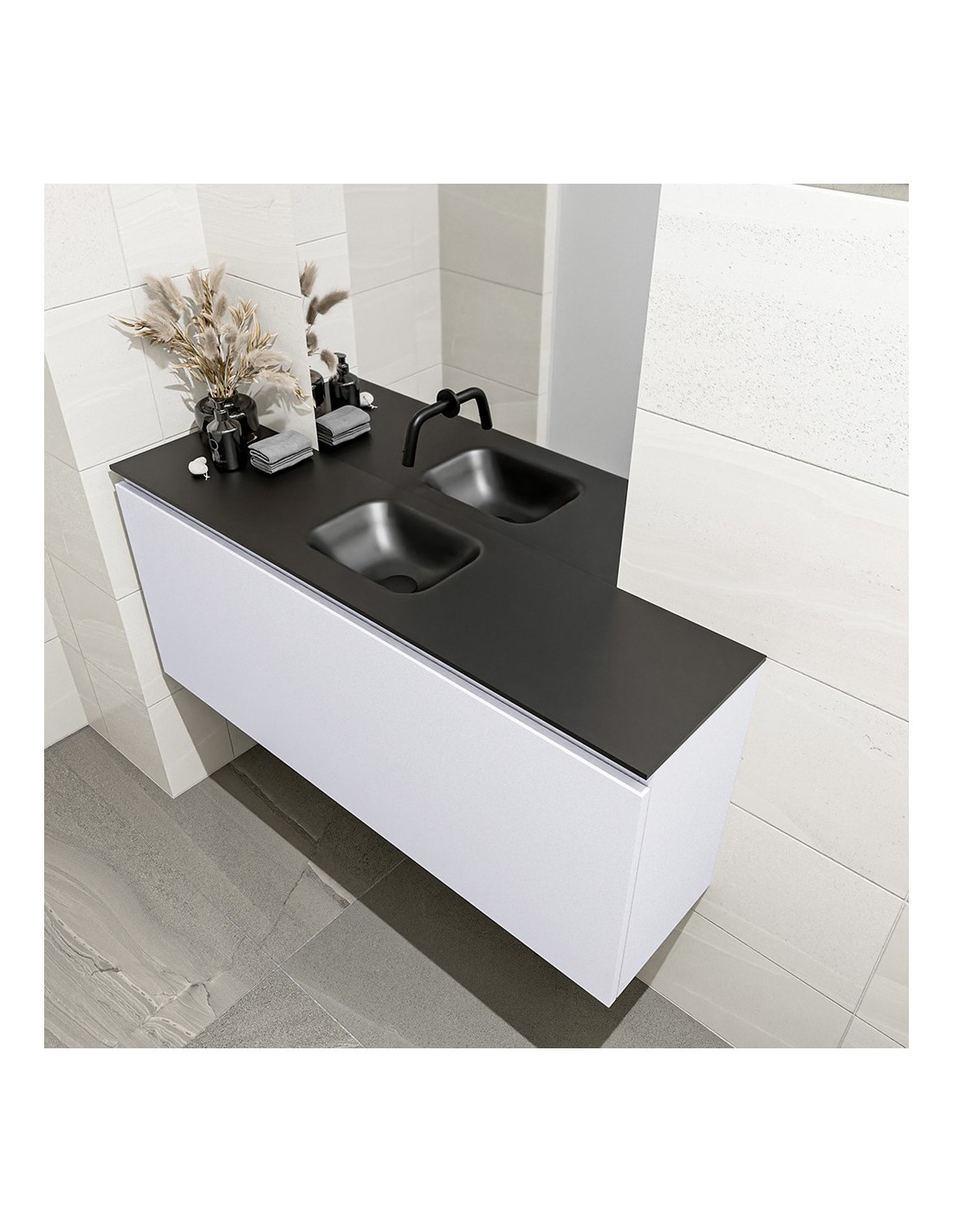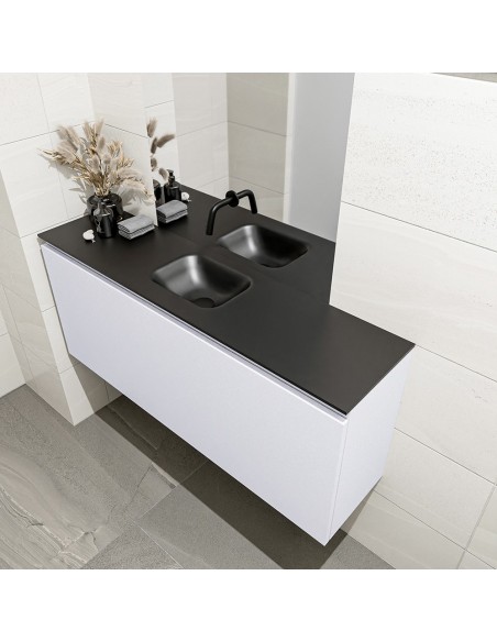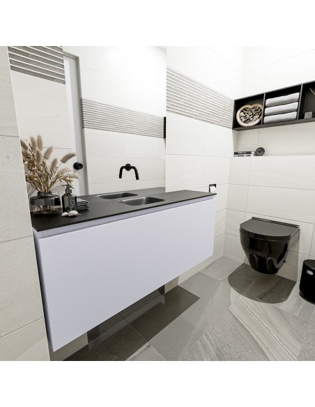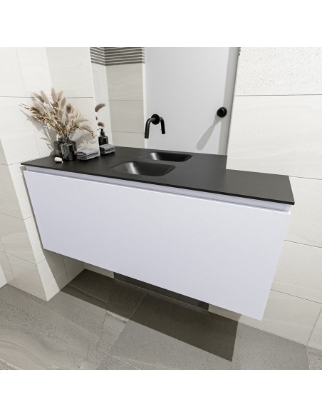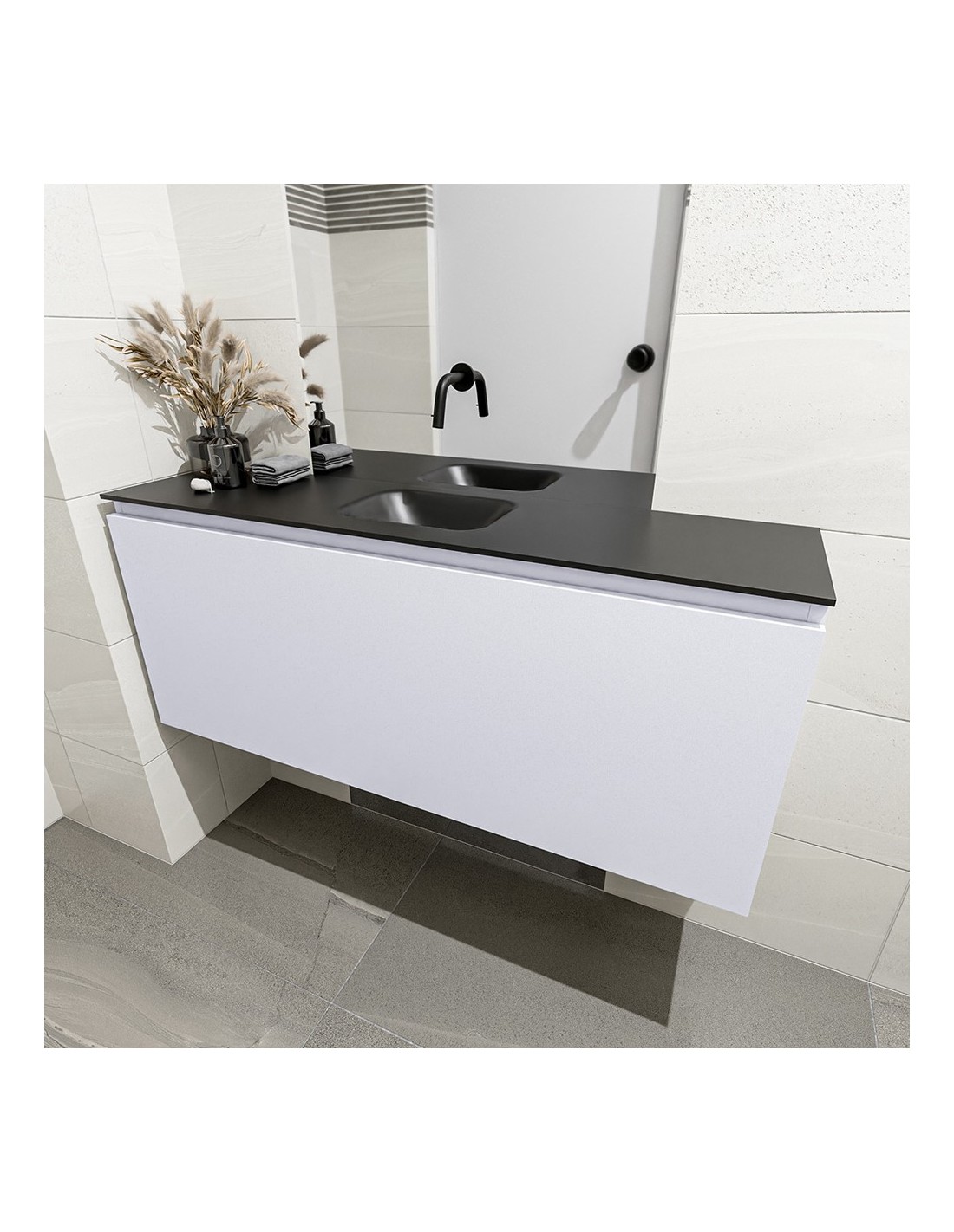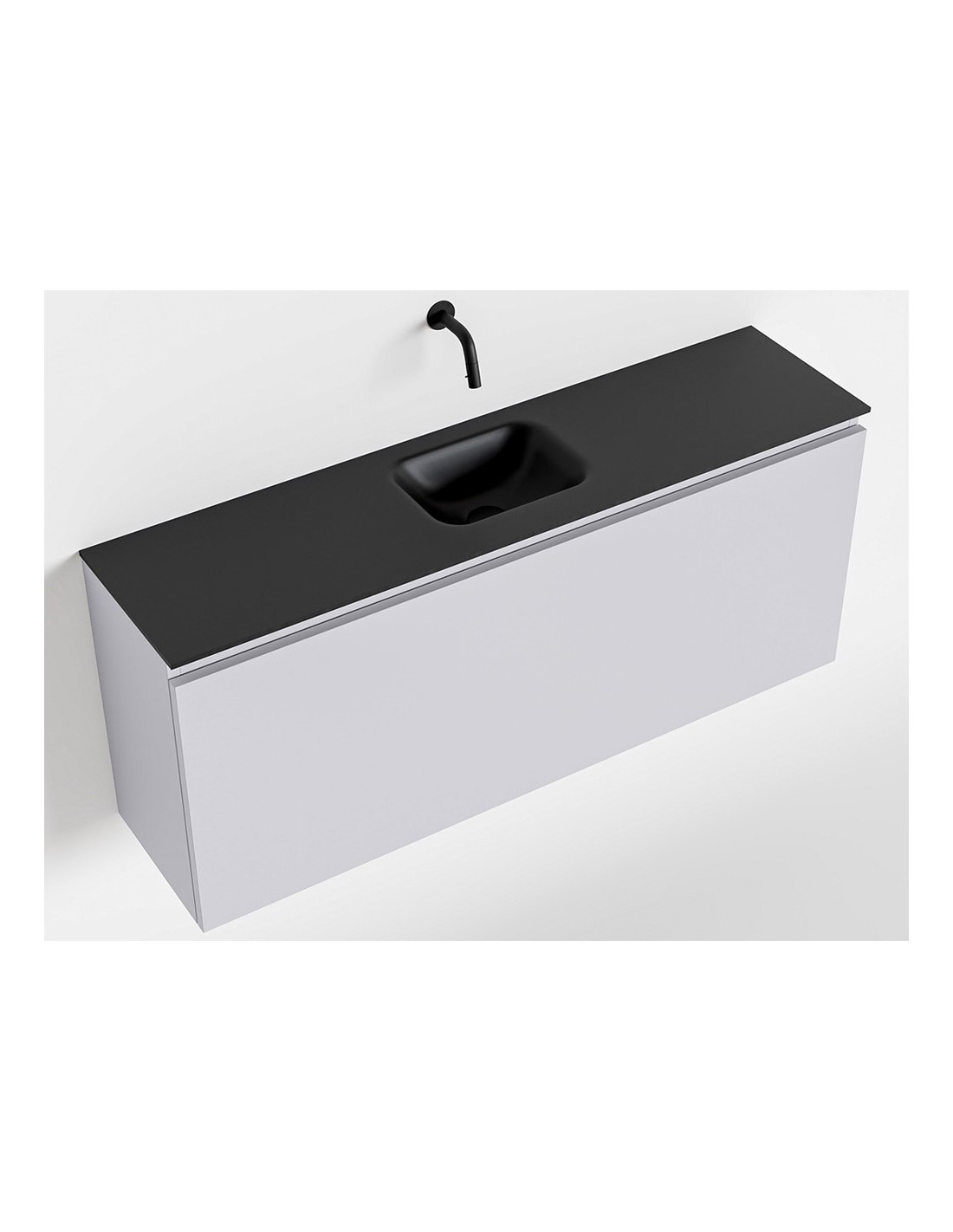 OLAN Komplet badmiljø med midt centreret håndvask til vægmonteret armatur. Badmiljøet kommer med 1 skuffe med fuldt udtræk, og er fremstillet i MDF. Håndvasken er fremstillet i sort solid surface. Badmiljøet måler 120 cm i bredden. Det viste armatur medfølger ikke i sættet.