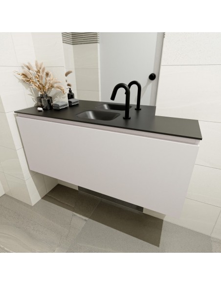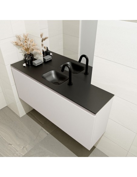 OLAN Komplet badmiljø med midt centreret håndvask til bordmonteret armatur. Badmiljøet kommer med 1 skuffe med fuldt udtræk, og er fremstillet i MDF. Håndvasken er fremstillet i sort solid surface. Badmiljøet måler 120 cm i bredden. Det viste armatur medfølger ikke i sættet.