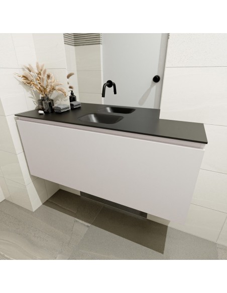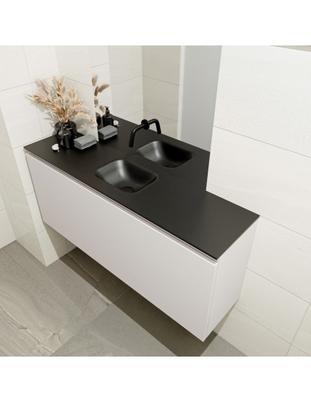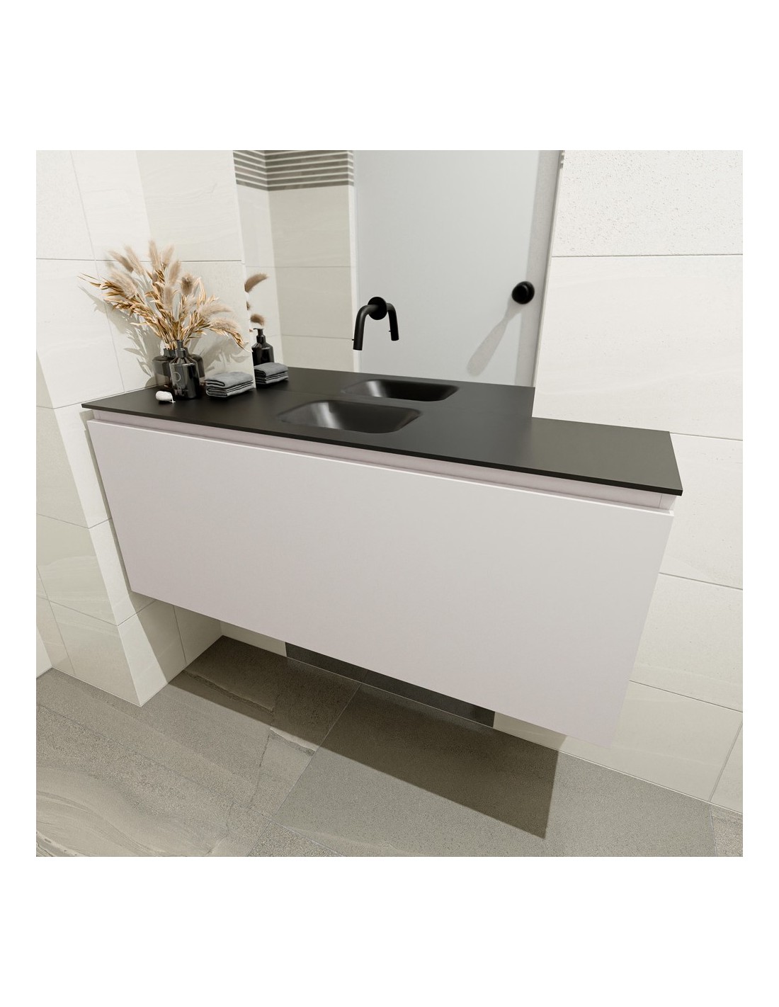OLAN Komplet badmiljø med midt centreret håndvask til vægmonteret armatur. Badmiljøet kommer med 1 skuffe med fuldt udtræk, og er fremstillet i MDF. Håndvasken er fremstillet i sort solid surface. Badmiljøet måler 120 cm i bredden. Det viste armatur medfølger ikke i sættet.
