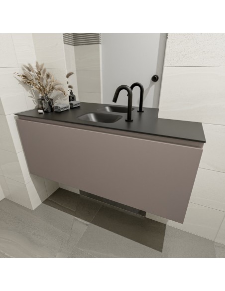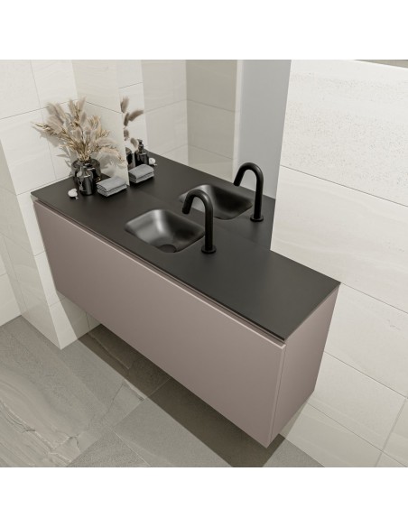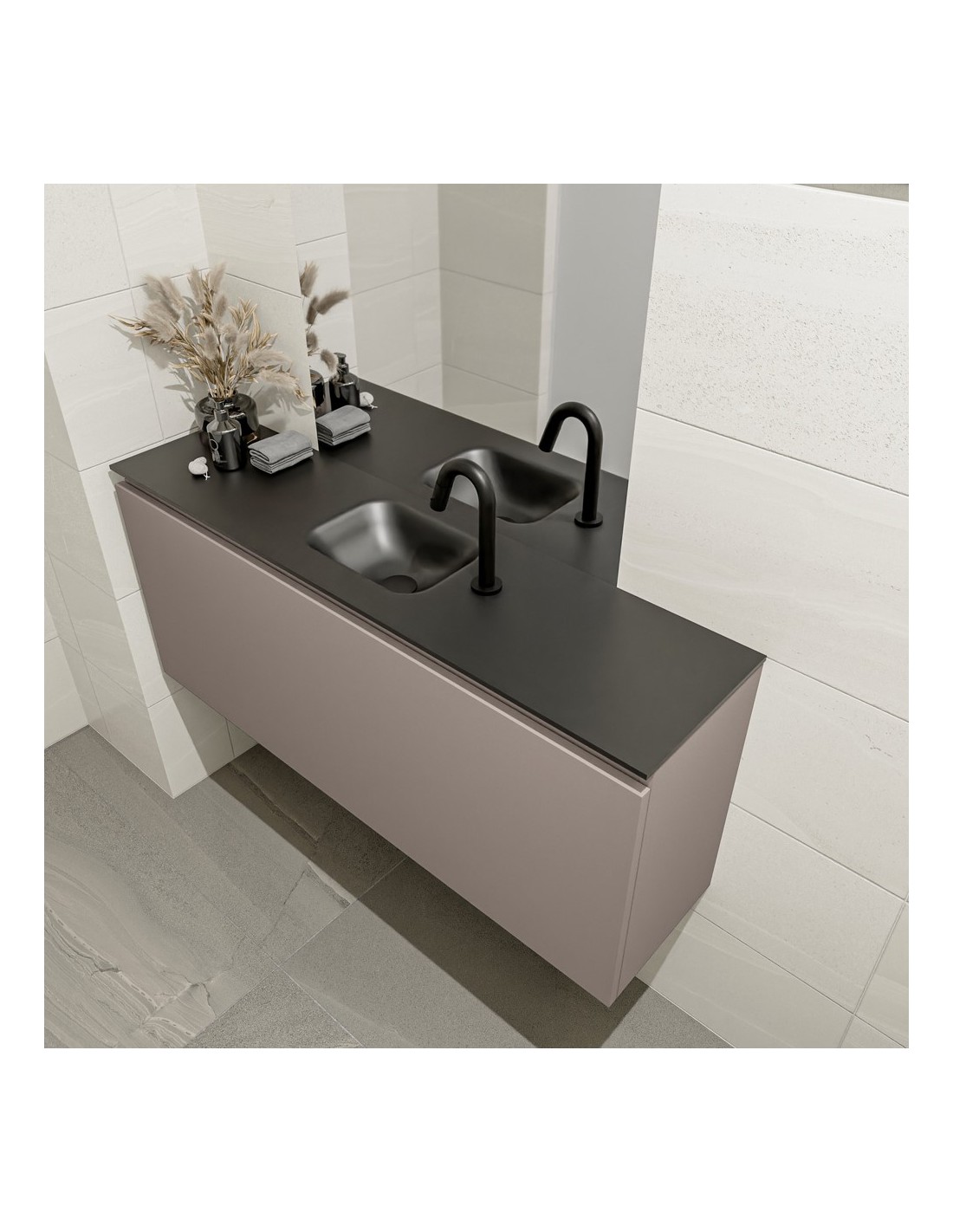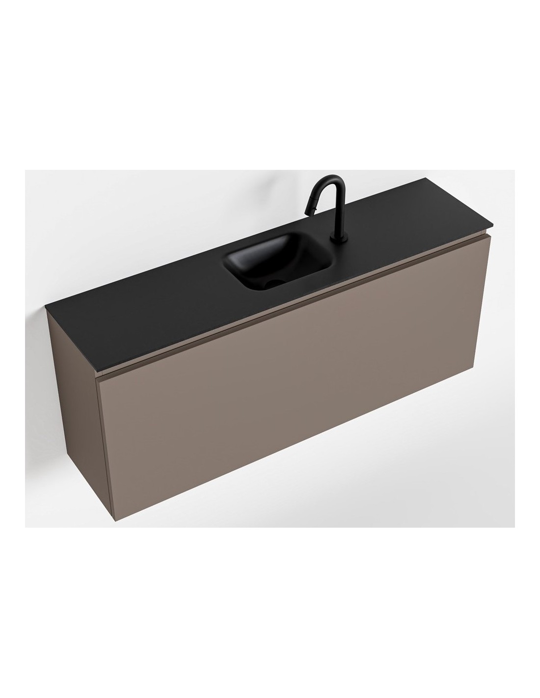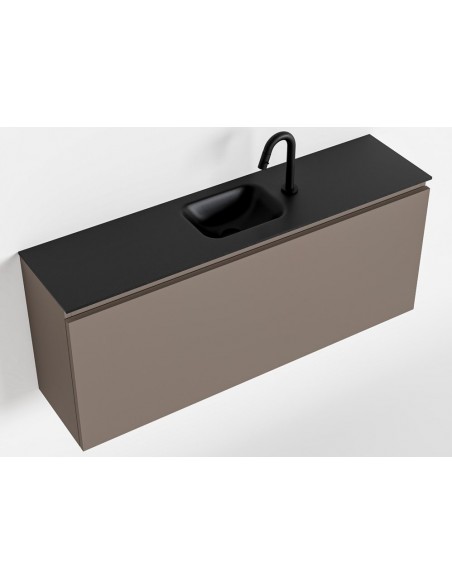 OLAN Komplet badmiljø med midt centreret håndvask til bordmonteret armatur. Badmiljøet kommer med 1 skuffe med fuldt udtræk, og er fremstillet i MDF. Håndvasken er fremstillet i sort solid surface. Badmiljøet måler 120 cm i bredden. Det viste armatur medfølger ikke i sættet.