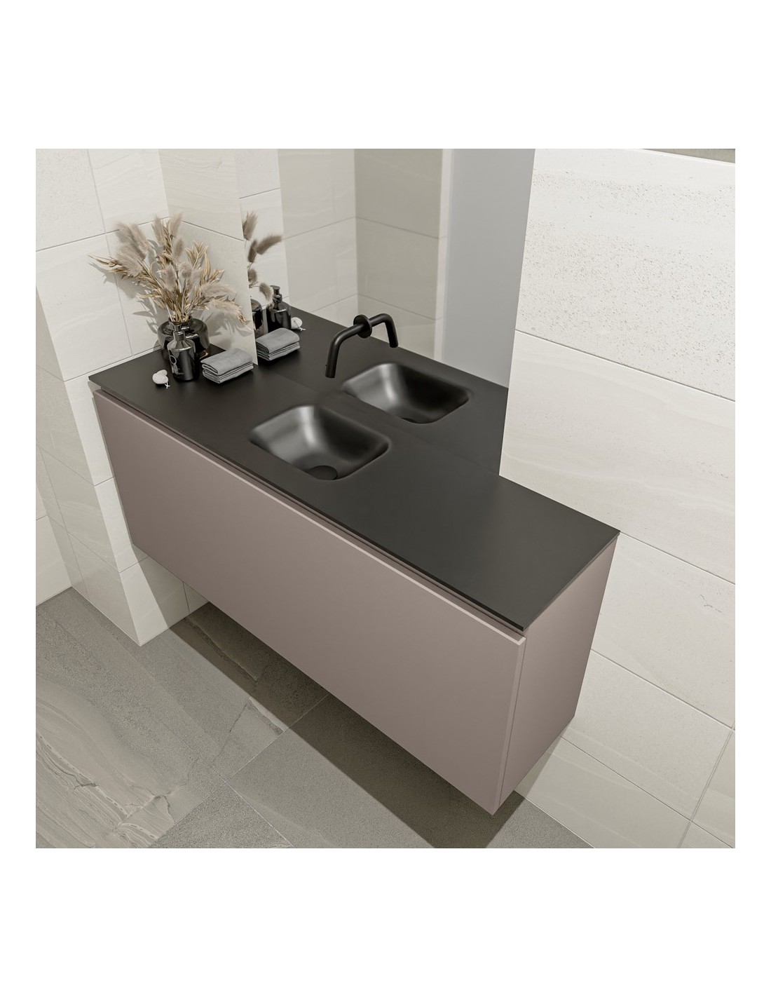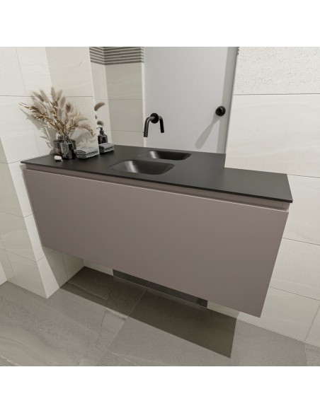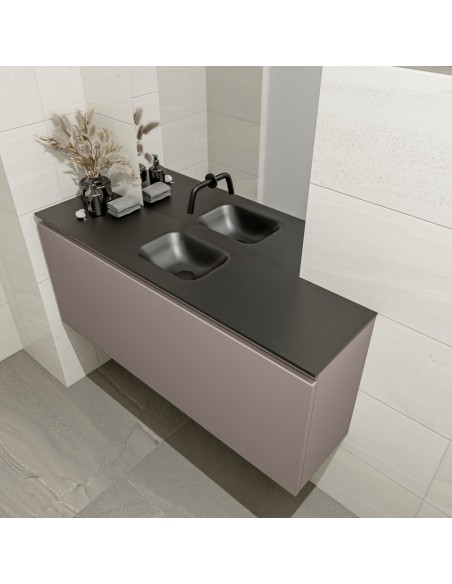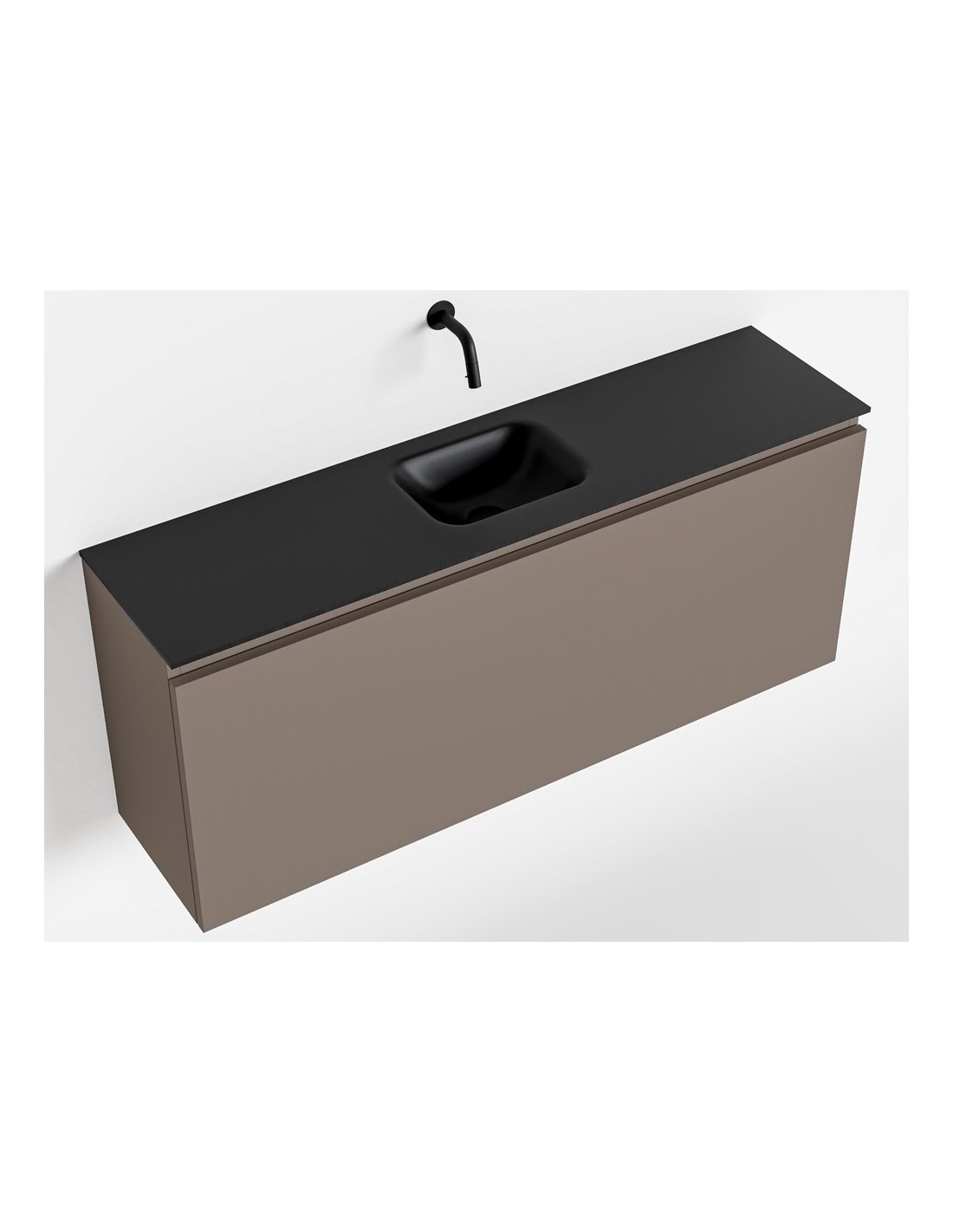 OLAN Komplet badmiljø med midt centreret håndvask til vægmonteret armatur. Badmiljøet kommer med 1 skuffe med fuldt udtræk, og er fremstillet i MDF. Håndvasken er fremstillet i sort solid surface. Badmiljøet måler 120 cm i bredden. Det viste armatur medfølger ikke i sættet.