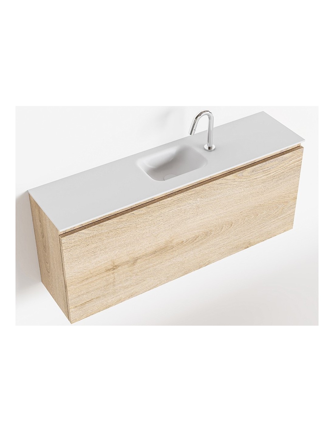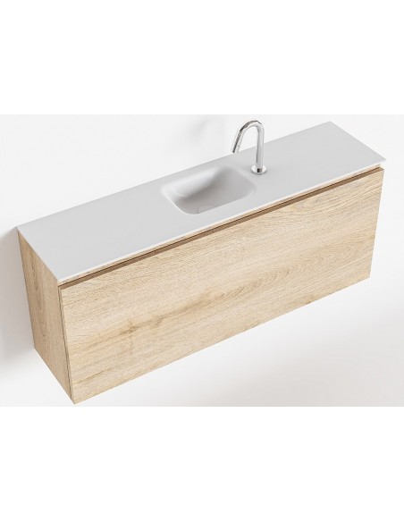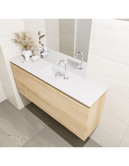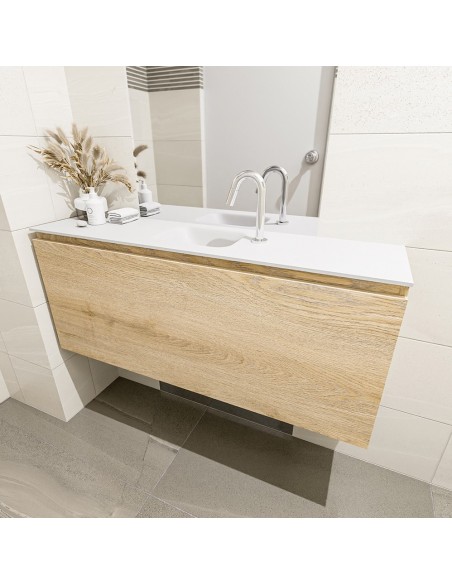 OLAN Komplet badmiljø med midt centreret håndvask til bordmonteret armatur. Badmiljøet kommer med 1 skuffe med fuldt udtræk, og er fremstillet i MDF med design af vasket eg. Håndvasken er fremstillet i talkumsfarvet (mat hvid) solid surface. Badmiljøet måler 120 cm i bredden. Det viste armatur medfølger ikke i sættet.