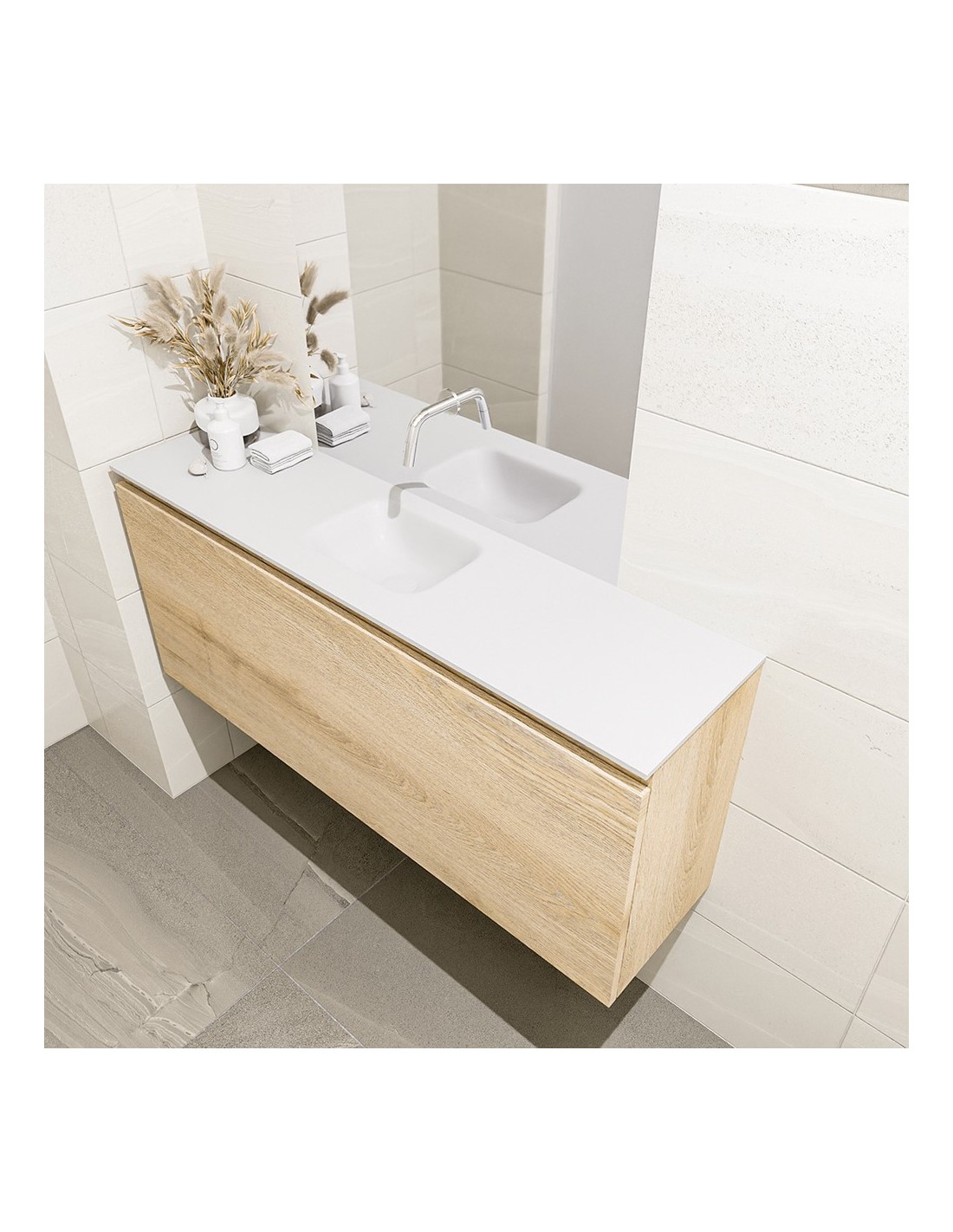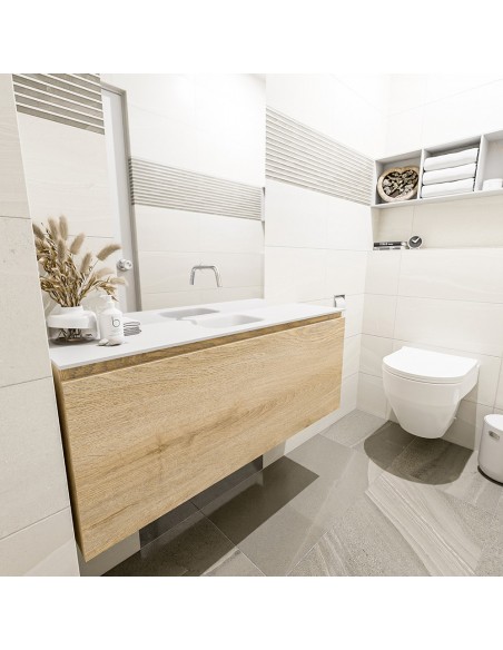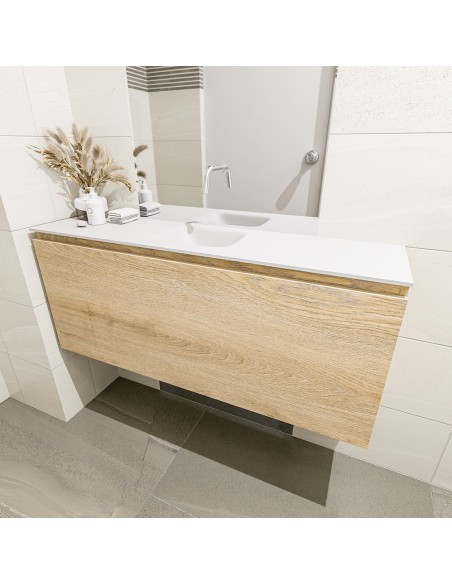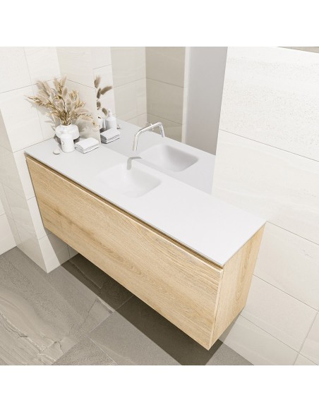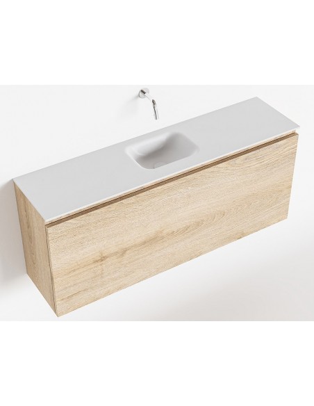 OLAN Komplet badmiljø med midt centreret håndvask til vægmonteret armatur. Badmiljøet kommer med 1 skuffe med fuldt udtræk, og er fremstillet i MDF med design af vasket eg. Håndvasken er fremstillet i talkumsfarvet (mat hvid) solid surface. Badmiljøet måler 120 cm i bredden. Det viste armatur medfølger ikke i sættet.