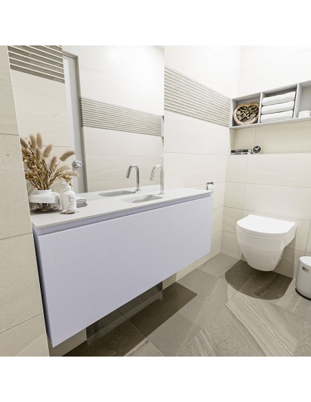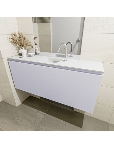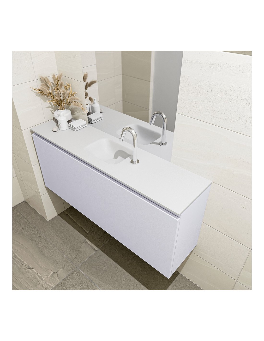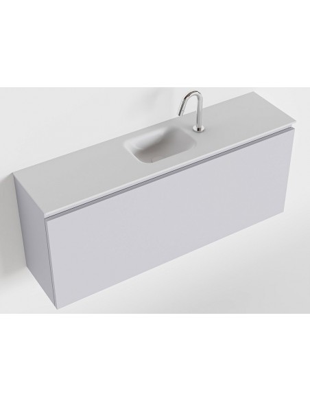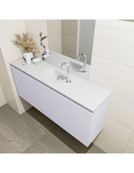 OLAN Komplet badmiljø med midt centreret håndvask til bordmonteret armatur. Badmiljøet kommer med 1 skuffe med fuldt udtræk, og er fremstillet i MDF. Håndvasken er fremstillet i talkumsfarvet (mat hvid) solid surface. Badmiljøet måler 120 cm i bredden. Det viste armatur medfølger ikke i sættet.