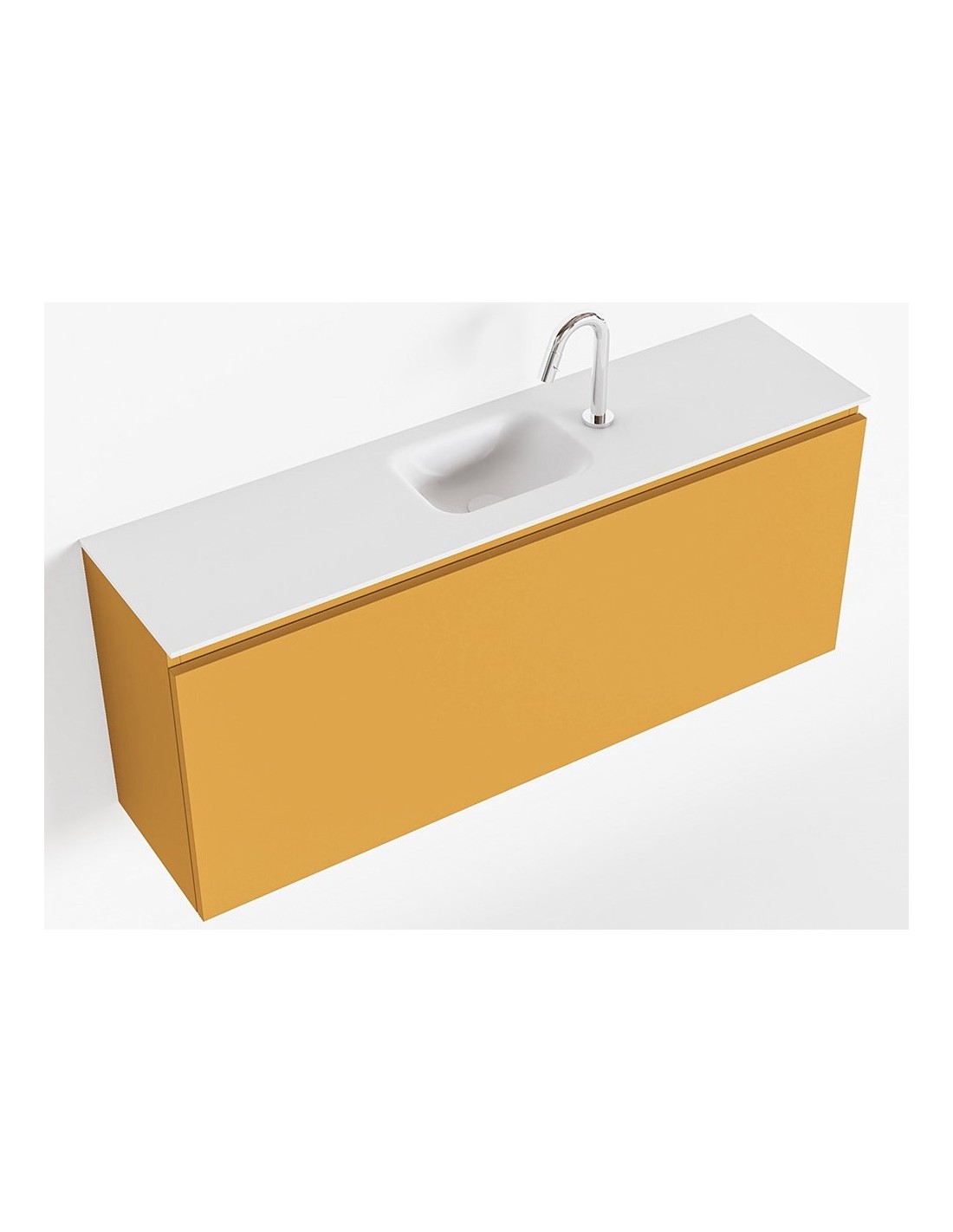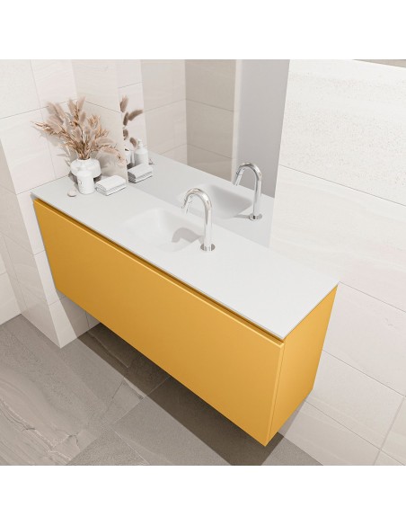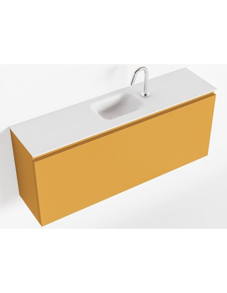 OLAN Komplet badmiljø med midt centreret håndvask til bordmonteret armatur. Badmiljøet kommer med 1 skuffe med fuldt udtræk, og er fremstillet i MDF. Håndvasken er fremstillet i talkumsfarvet (mat hvid) solid surface. Badmiljøet måler 120 cm i bredden. Det viste armatur medfølger ikke i sættet.