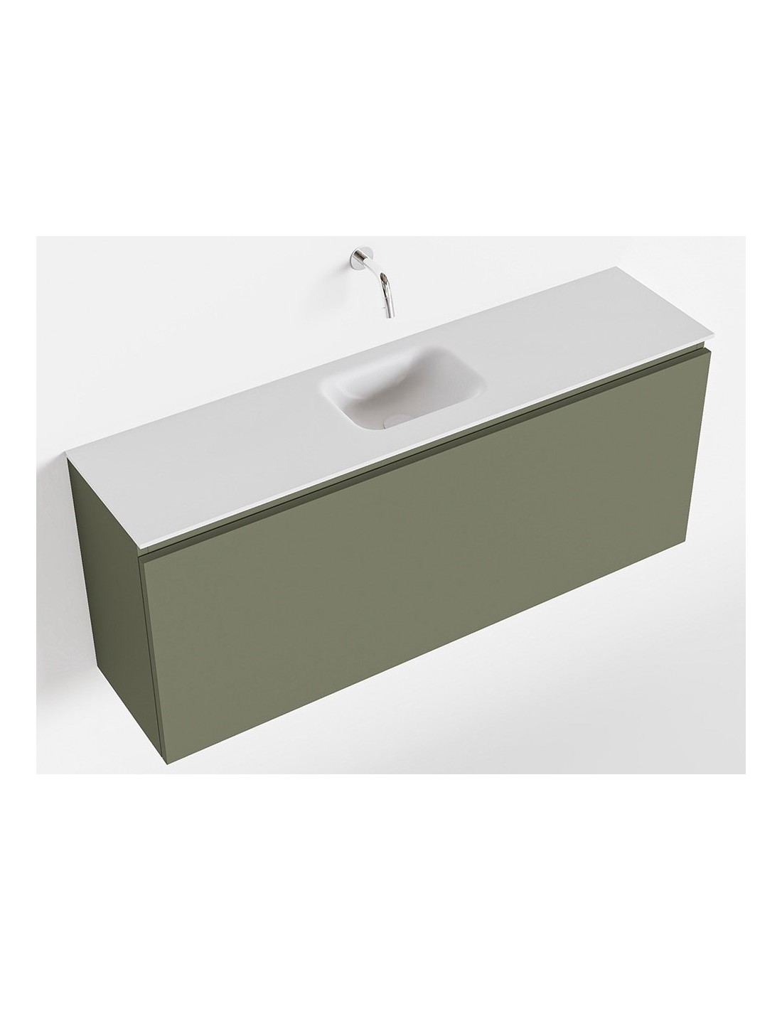 OLAN Komplet badmiljø med midt centreret håndvask til vægmonteret armatur. Badmiljøet kommer med 1 skuffe med fuldt udtræk, og er fremstillet i MDF. Håndvasken er fremstillet i talkumsfarvet (mat hvid) solid surface. Badmiljøet måler 120 cm i bredden. Det viste armatur medfølger ikke i sættet.