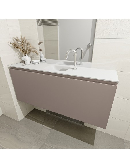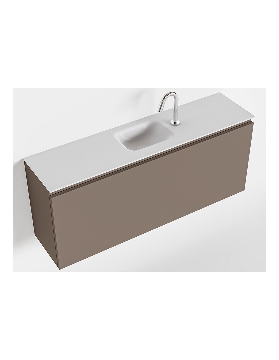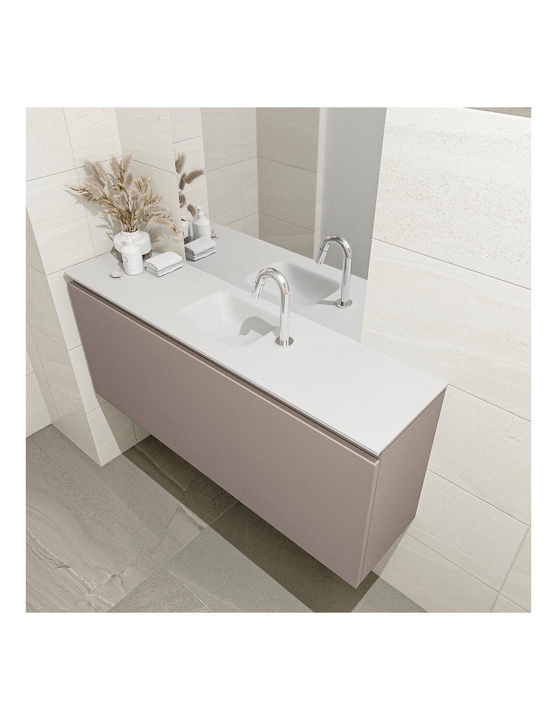OLAN Komplet badmiljø med midt centreret håndvask til bordmonteret armatur. Badmiljøet kommer med 1 skuffe med fuldt udtræk, og er fremstillet i MDF. Håndvasken er fremstillet i talkumsfarvet (mat hvid) solid surface. Badmiljøet måler 120 cm i bredden. Det viste armatur medfølger ikke i sættet.