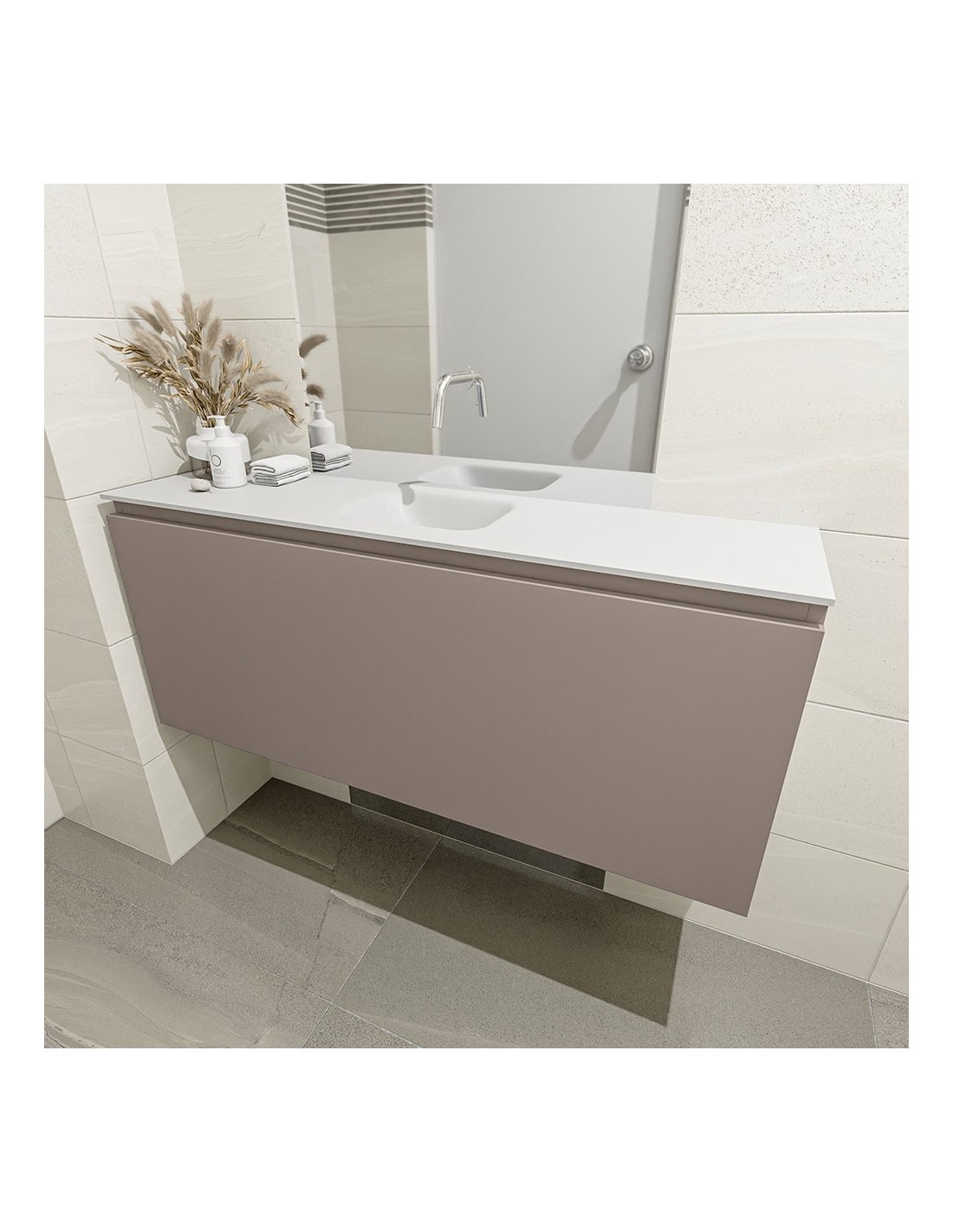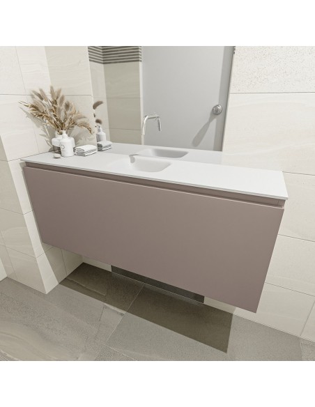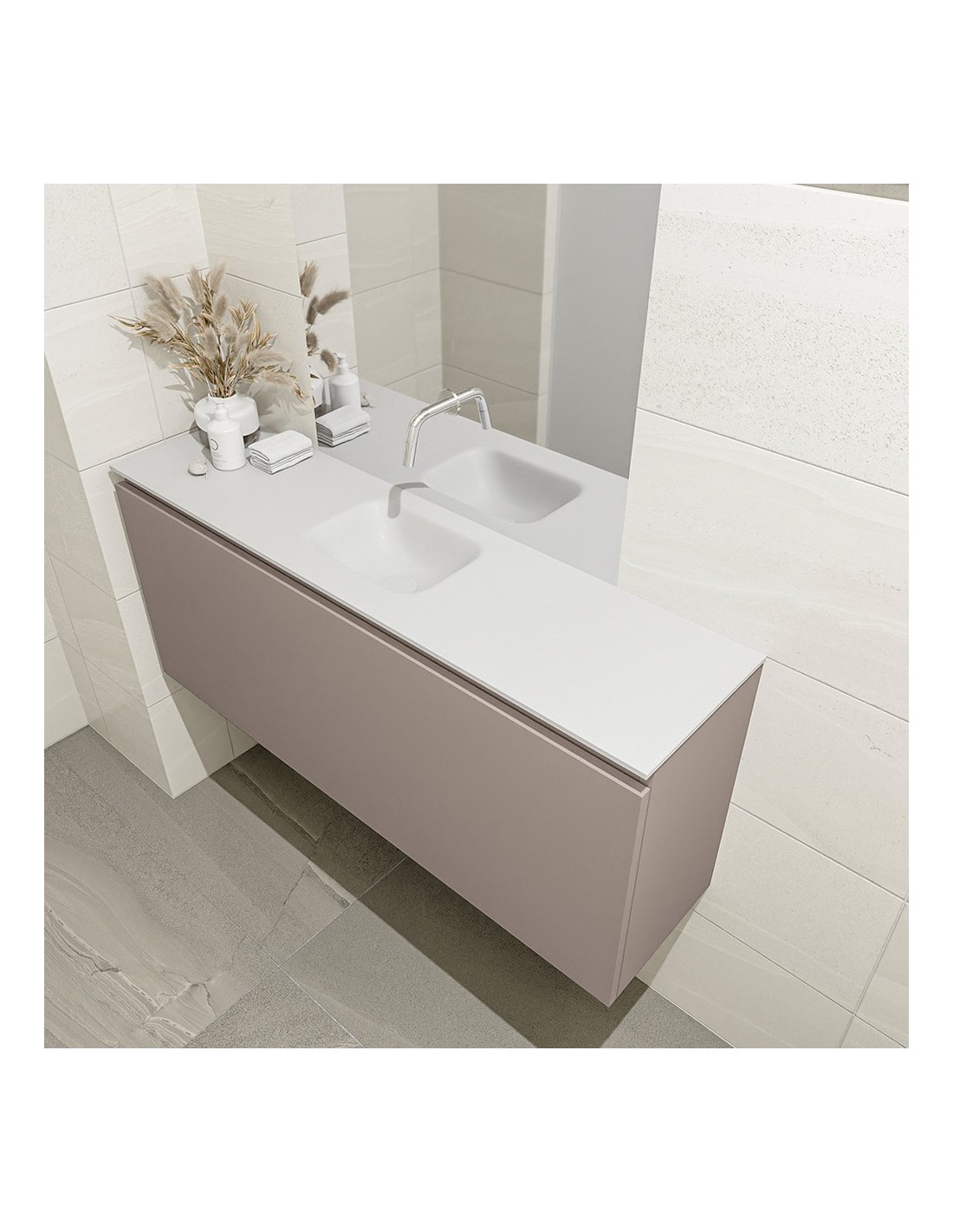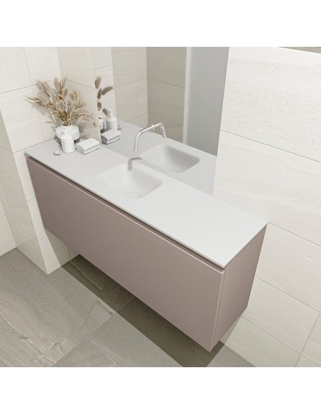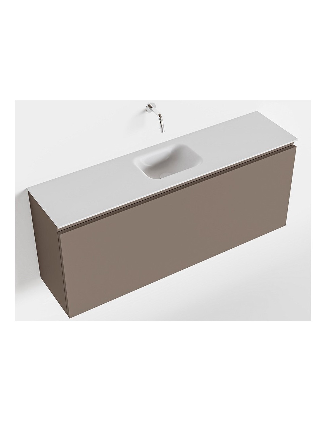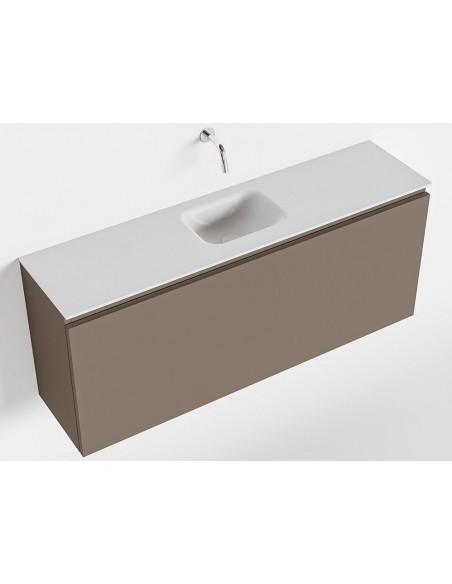 OLAN Komplet badmiljø med midt centreret håndvask til vægmonteret armatur. Badmiljøet kommer med 1 skuffe med fuldt udtræk, og er fremstillet i MDF. Håndvasken er fremstillet i talkumsfarvet (mat hvid) solid surface. Badmiljøet måler 120 cm i bredden. Det viste armatur medfølger ikke i sættet.
