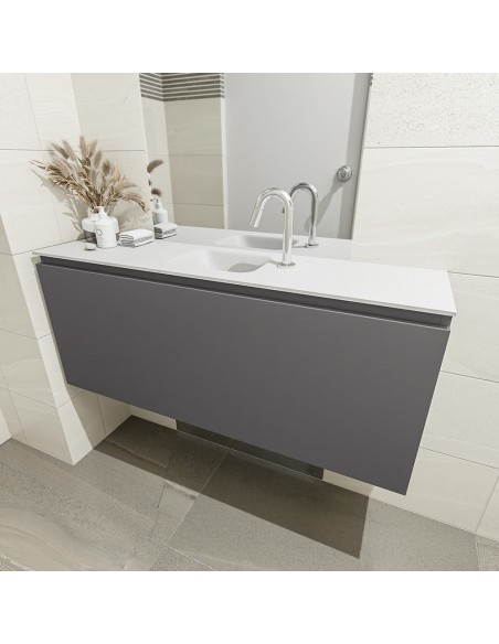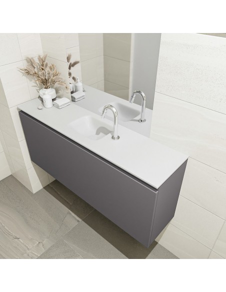 OLAN Komplet badmiljø med midt centreret håndvask til bordmonteret armatur. Badmiljøet kommer med 1 skuffe med fuldt udtræk, og er fremstillet i MDF. Håndvasken er fremstillet i talkumsfarvet (mat hvid) solid surface. Badmiljøet måler 120 cm i bredden. Det viste armatur medfølger ikke i sættet.