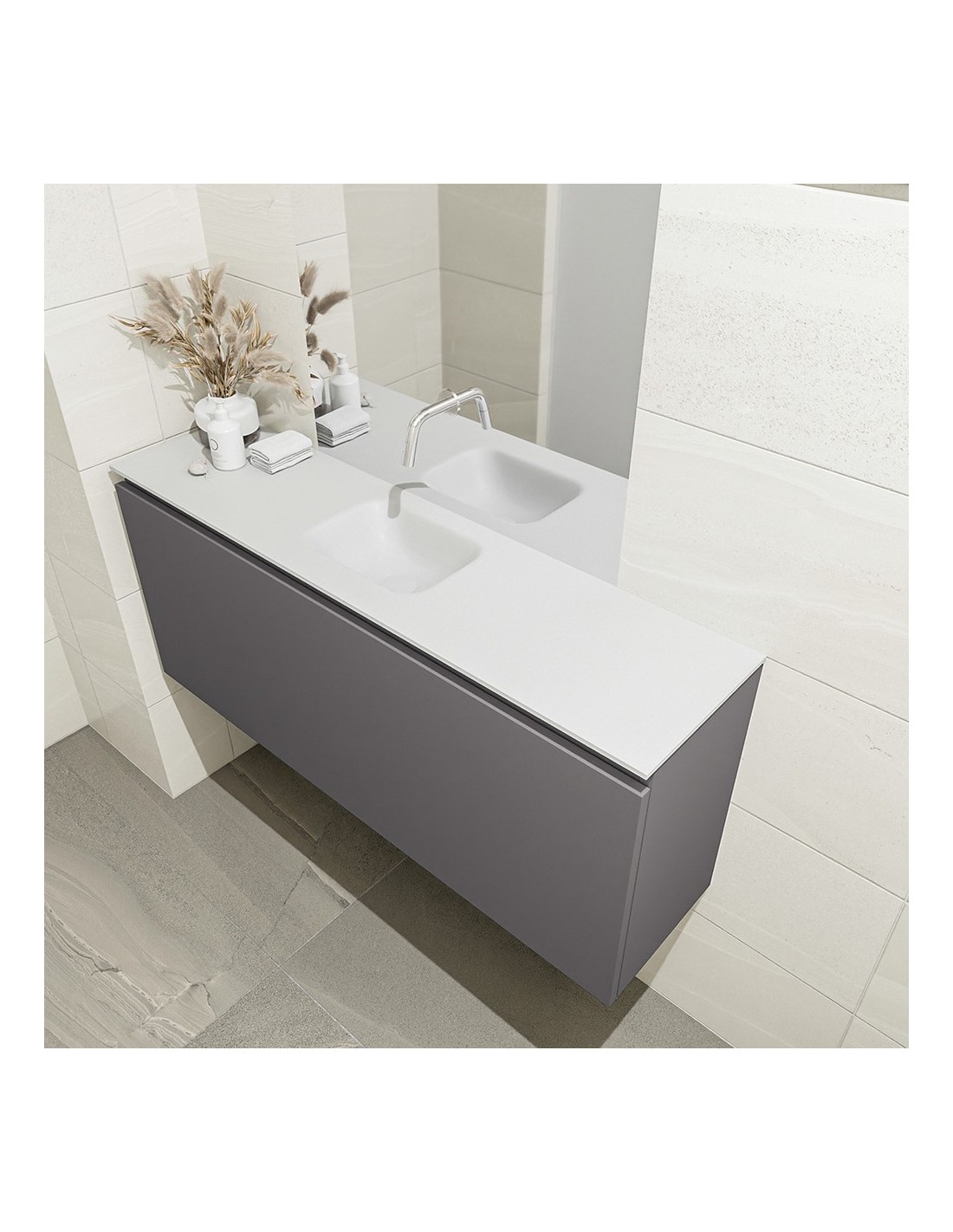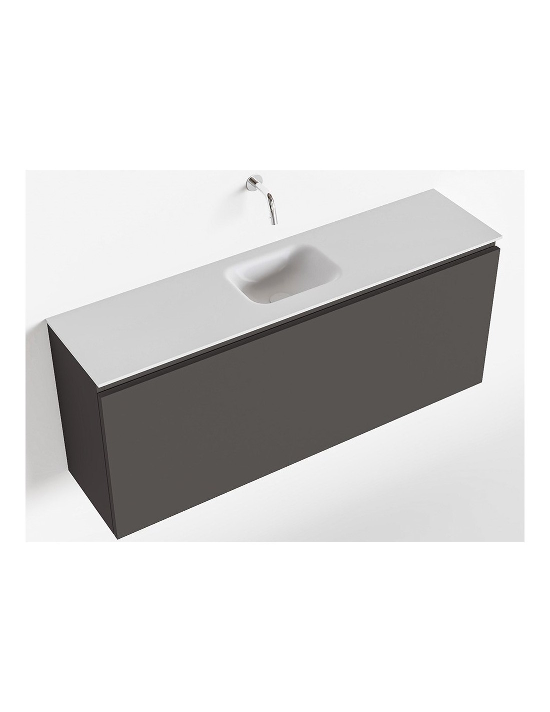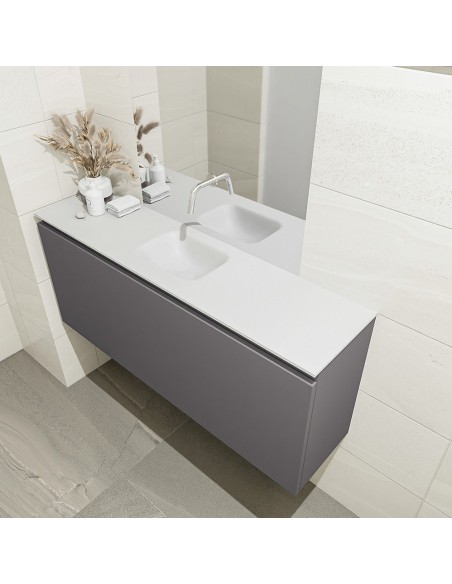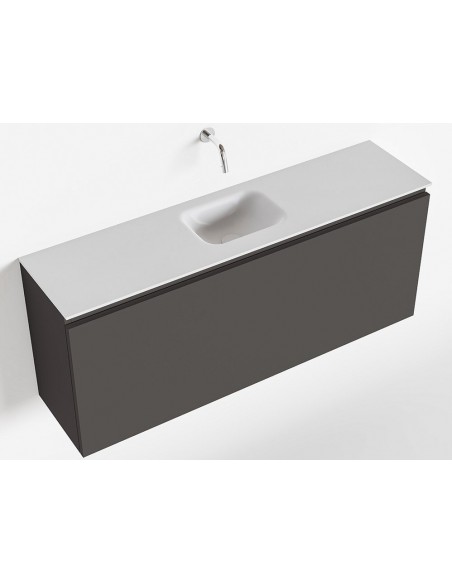 OLAN Komplet badmiljø med midt centreret håndvask til vægmonteret armatur. Badmiljøet kommer med 1 skuffe med fuldt udtræk, og er fremstillet i MDF. Håndvasken er fremstillet i talkumsfarvet (mat hvid) solid surface. Badmiljøet måler 120 cm i bredden. Det viste armatur medfølger ikke i sættet.