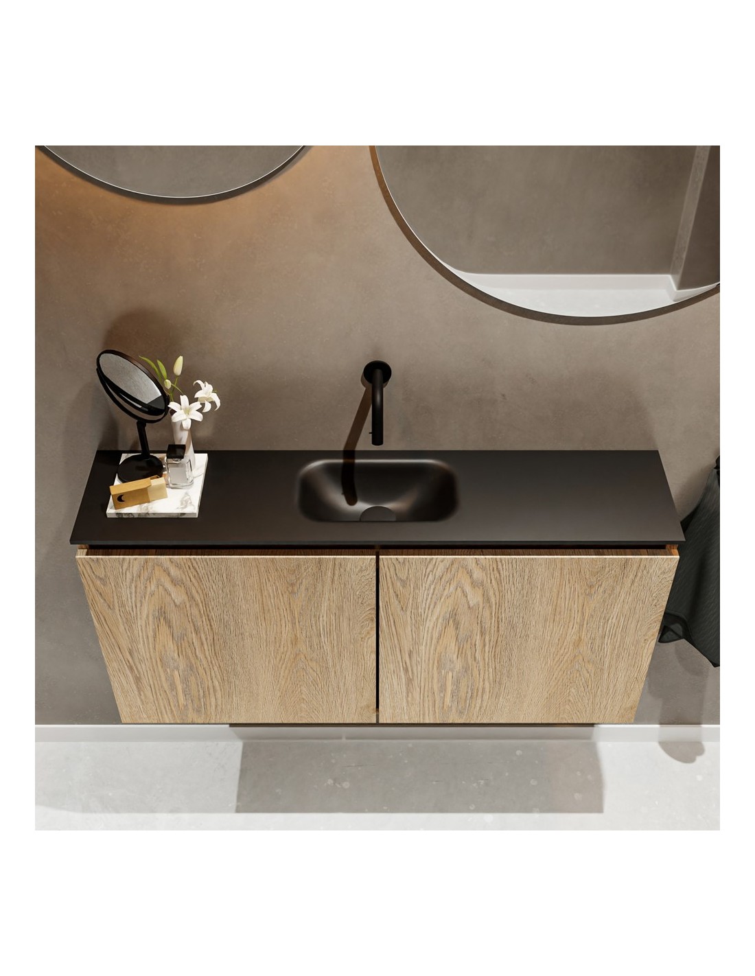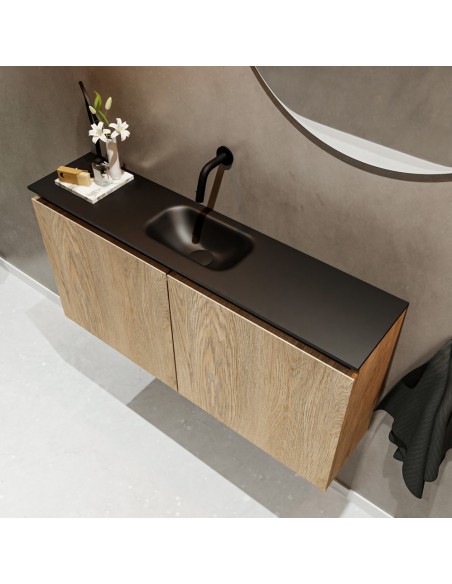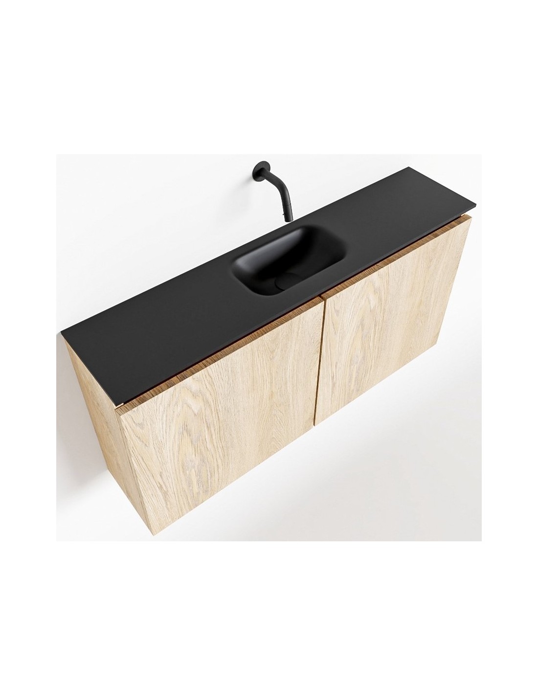 TURE Komplet badmiljø med midt centreret håndvask til vægmonteret armatur. Badmiljøet kommer med 1 dobbeltskab med 1 hylde, og er fremstillet i MDF med design af vasket eg. Håndvasken er fremstillet i sort solid surface. Badmiljøet måler 100 cm i bredden. Det viste armatur medfølger ikke i sættet.