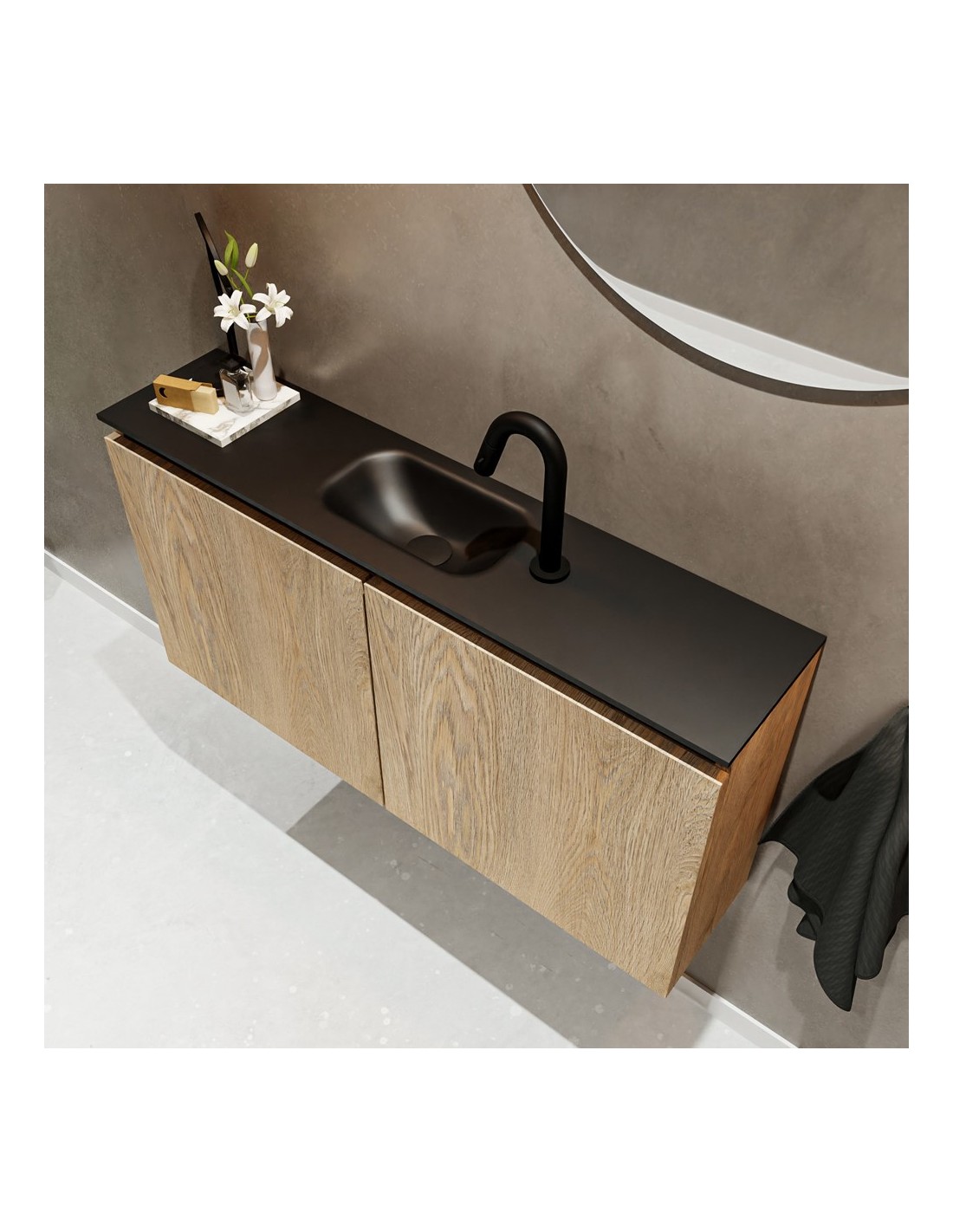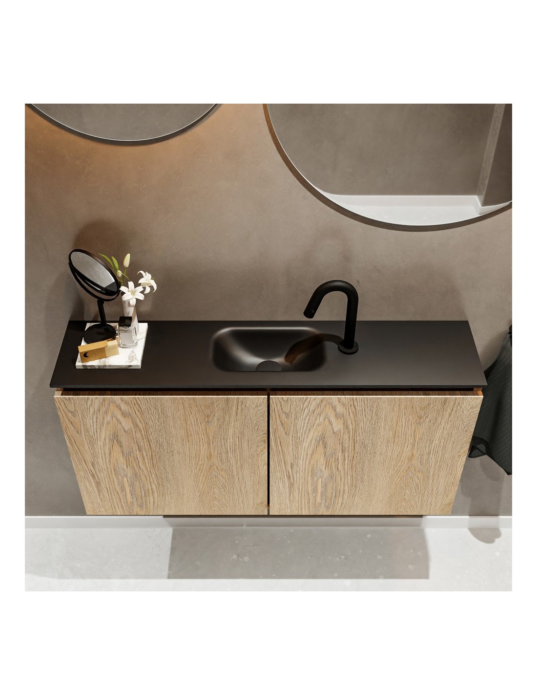 TURE Komplet badmiljø med midt centreret håndvask til bordmonteret armatur. Badmiljøet kommer med 1 dobbeltskab med 1 hylde, og er fremstillet i MDF med design af vasket eg. Håndvasken er fremstillet i sort solid surface. Badmiljøet måler 100 cm i bredden. Det viste armatur medfølger ikke i sættet.