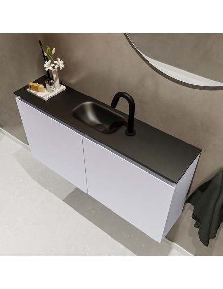 TURE Komplet badmiljø med midt centreret håndvask til bordmonteret armatur. Badmiljøet kommer med 1 dobbeltskab med 1 hylde, og er fremstillet i MDF. Håndvasken er fremstillet i sort solid surface. Badmiljøet måler 100 cm i bredden. Det viste armatur medfølger ikke i sættet.
