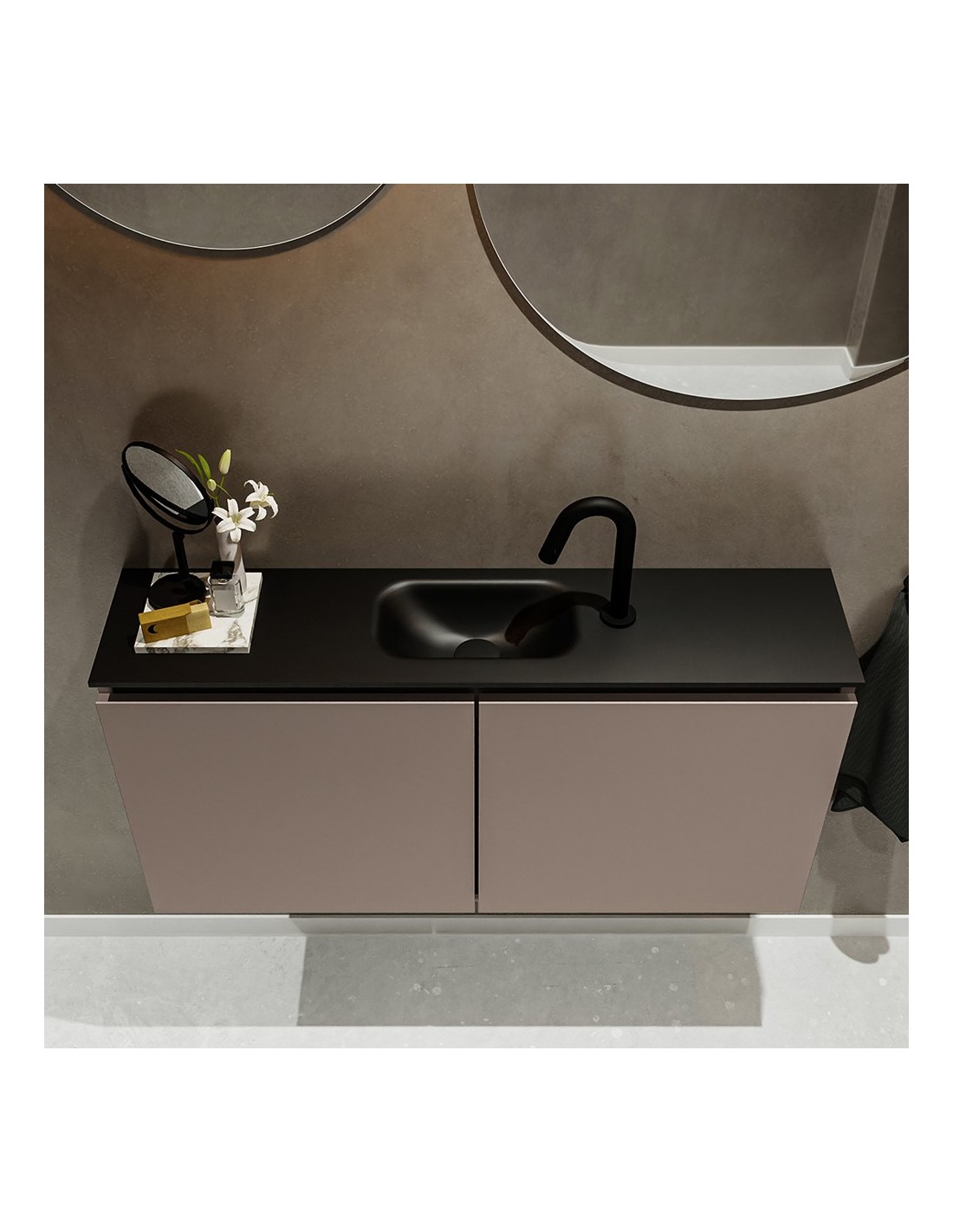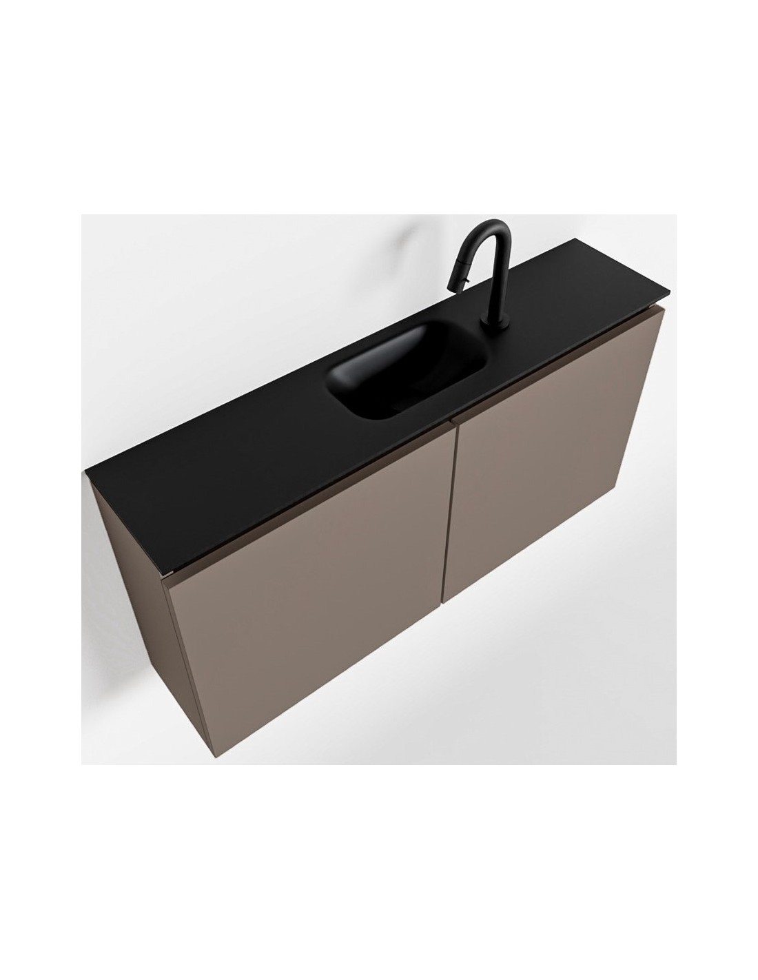 TURE Komplet badmiljø med midt centreret håndvask til bordmonteret armatur. Badmiljøet kommer med 1 dobbeltskab med 1 hylde, og er fremstillet i MDF. Håndvasken er fremstillet i sort solid surface. Badmiljøet måler 100 cm i bredden. Det viste armatur medfølger ikke i sættet.