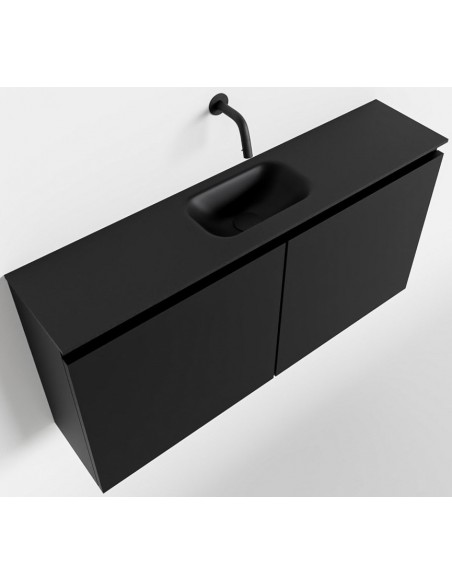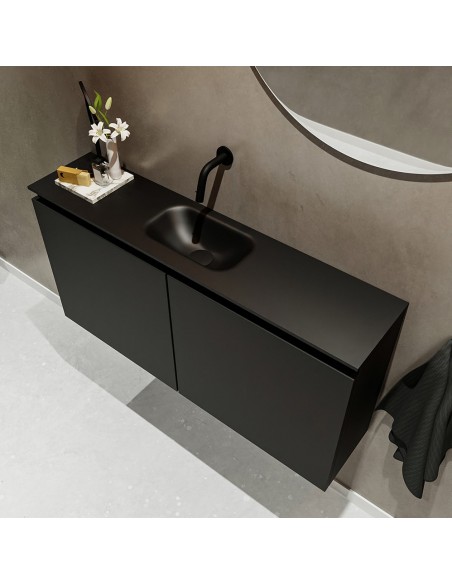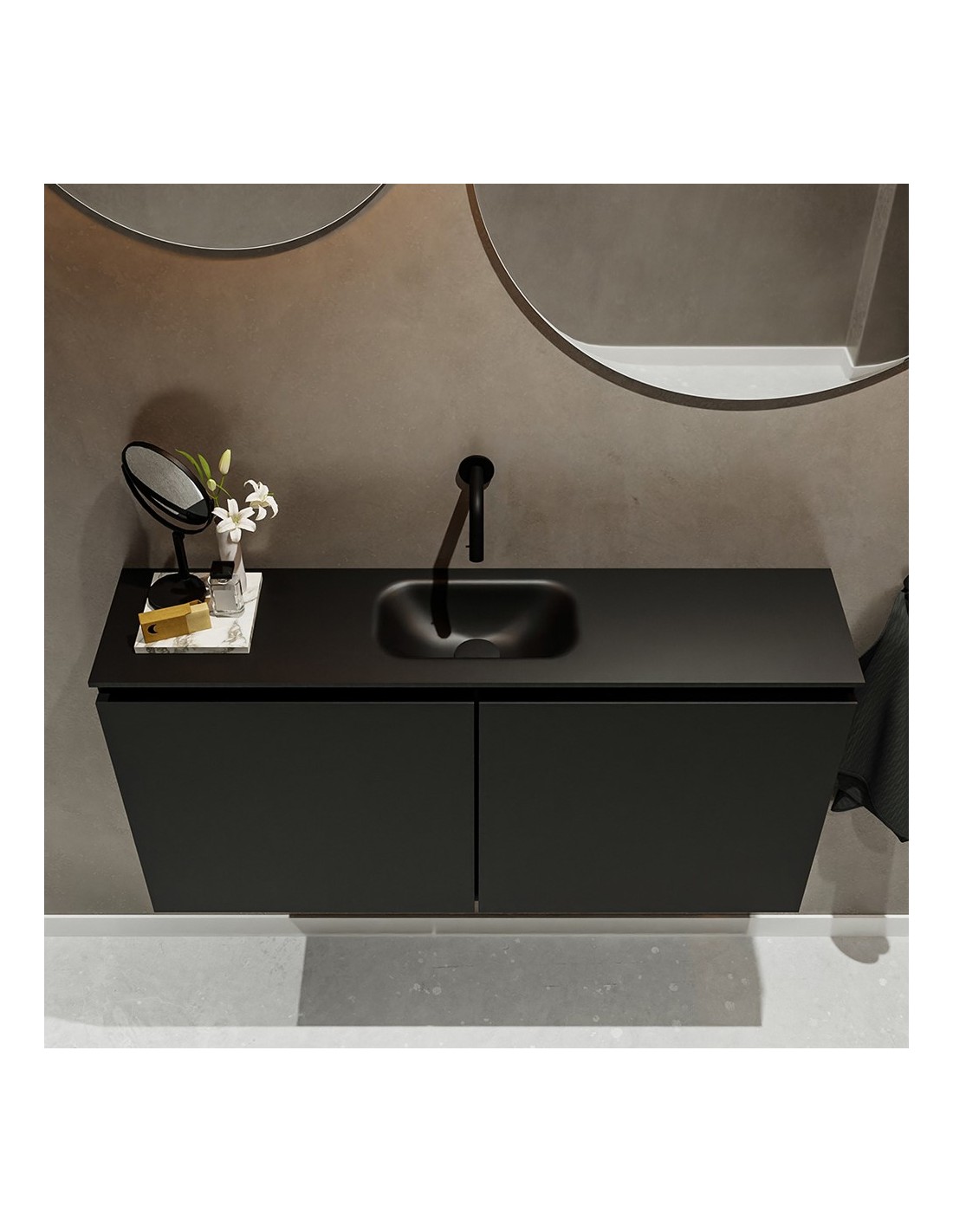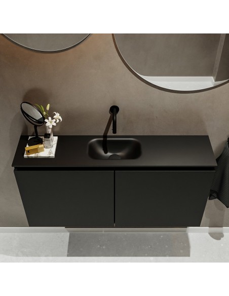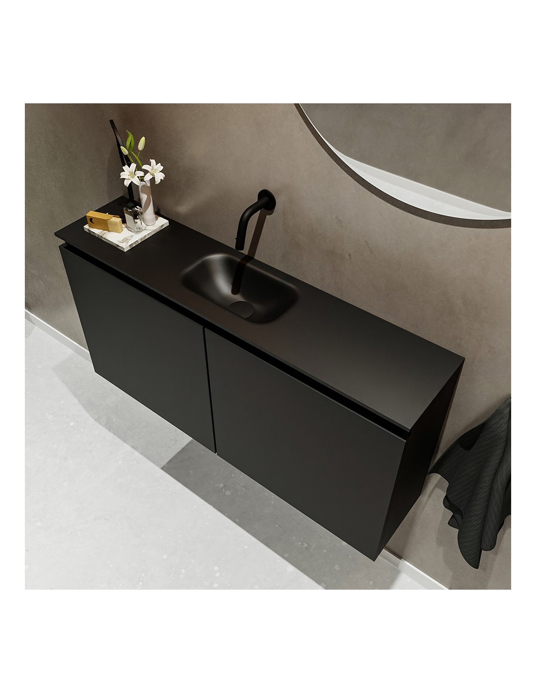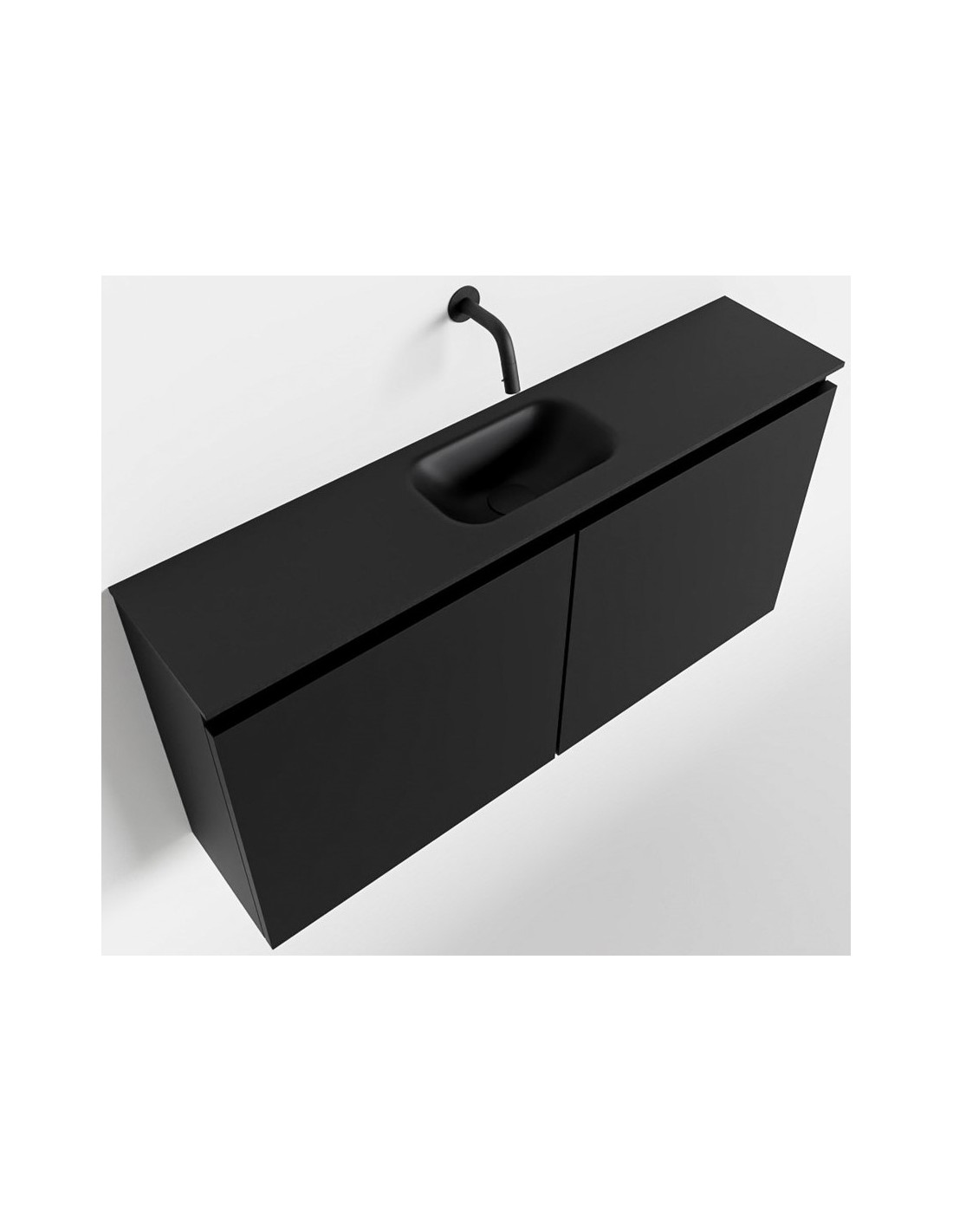 TURE Komplet badmiljø med midt centreret håndvask til vægmonteret armatur. Badmiljøet kommer med 1 dobbeltskab med 1 hylde, og er fremstillet i MDF. Håndvasken er fremstillet i sort solid surface. Badmiljøet måler 100 cm i bredden. Det viste armatur medfølger ikke i sættet.