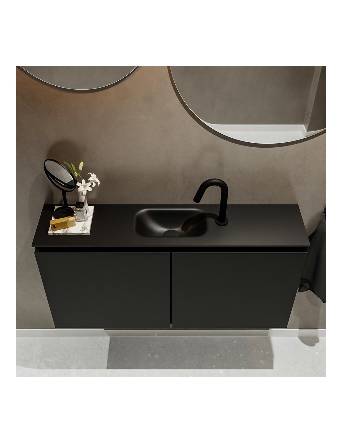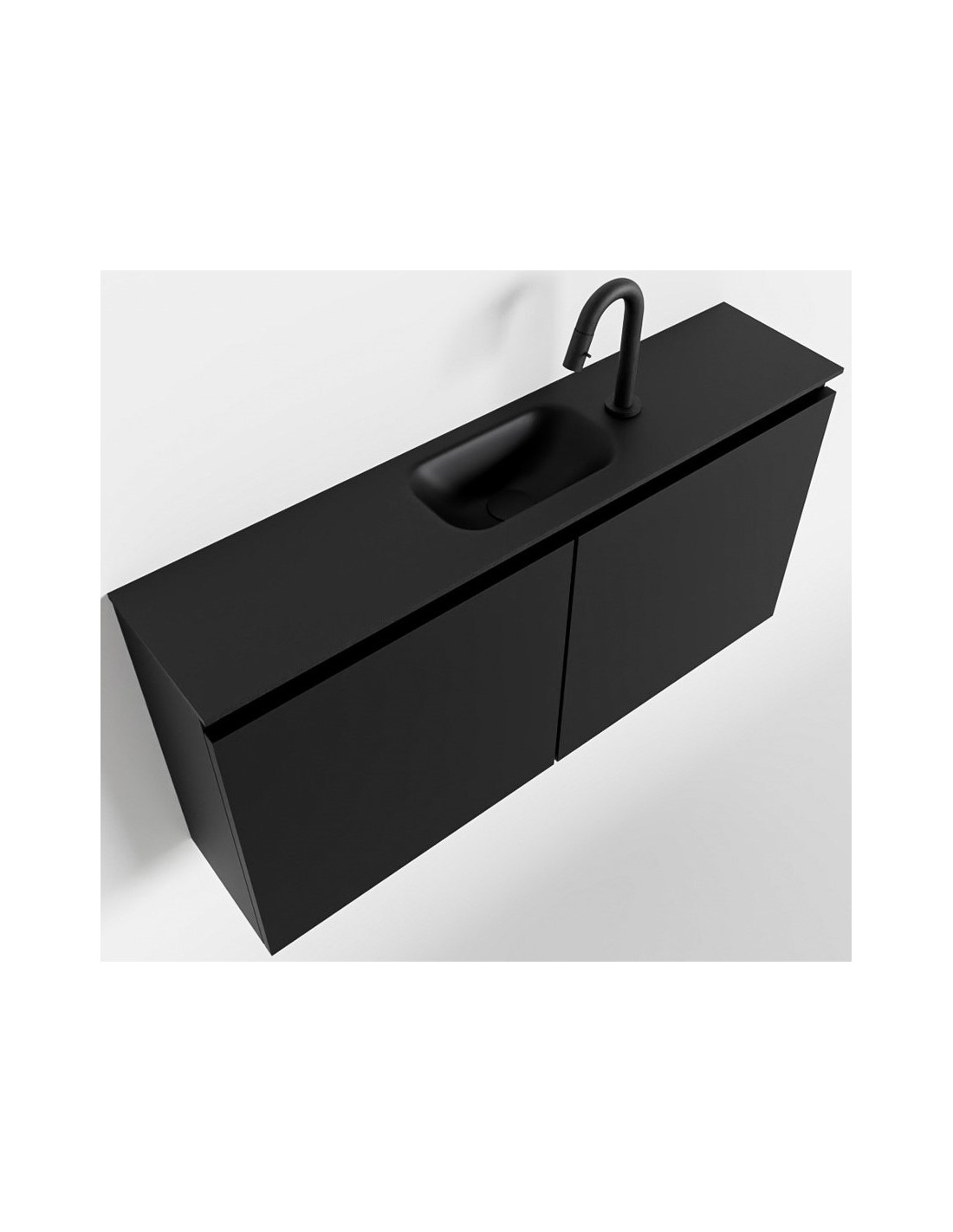 TURE Komplet badmiljø med midt centreret håndvask til bordmonteret armatur. Badmiljøet kommer med 1 dobbeltskab med 1 hylde, og er fremstillet i MDF. Håndvasken er fremstillet i sort solid surface. Badmiljøet måler 100 cm i bredden. Det viste armatur medfølger ikke i sættet.