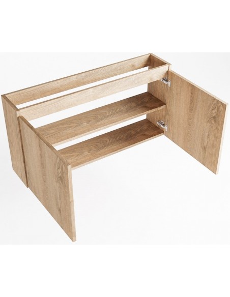 TURE Komplet badmiljø med midt centreret håndvask til bordmonteret armatur. Badmiljøet kommer med 1 dobbeltskab med 1 hylde, og er fremstillet i MDF med design af vasket eg. Håndvasken er fremstillet i talkum farvet (mat hvid) solid surface. Badmiljøet måler 100 cm i bredden. Det viste armatur medfølger ikke i sættet.