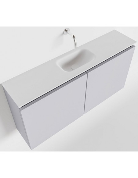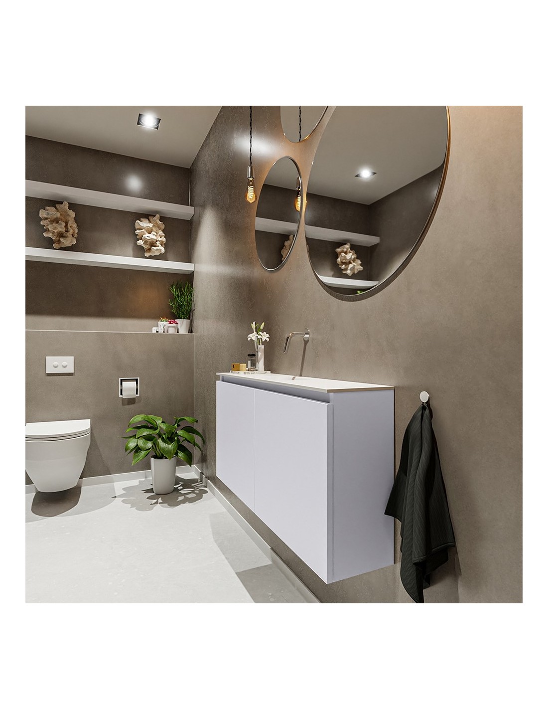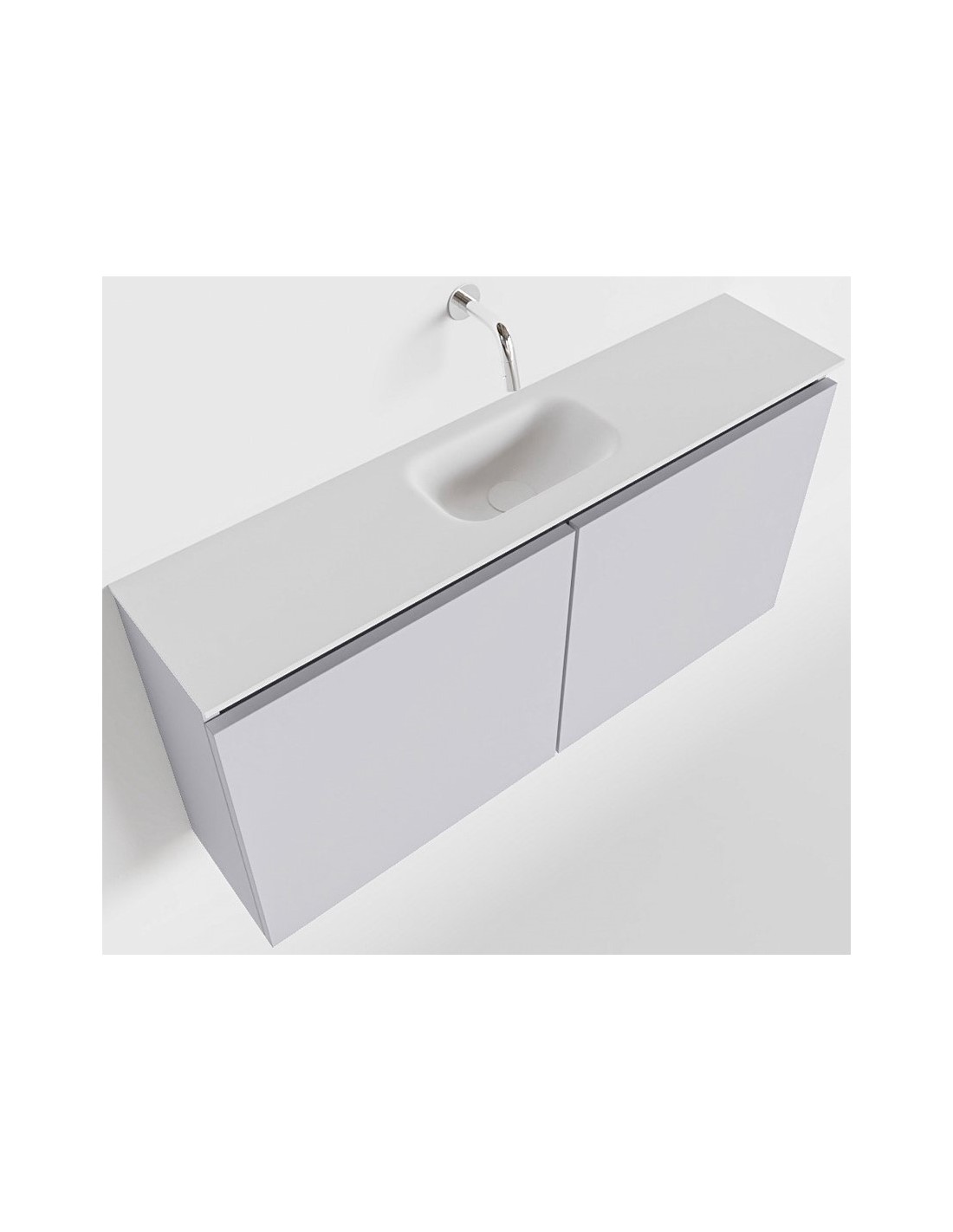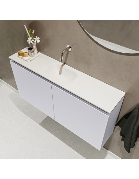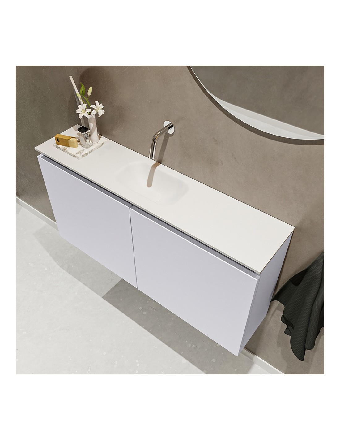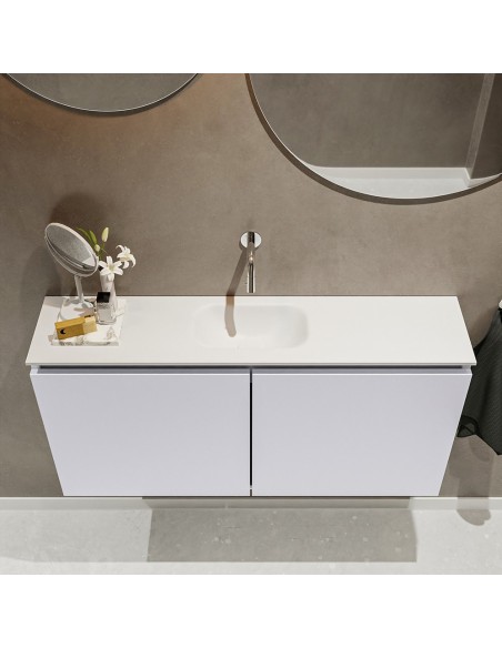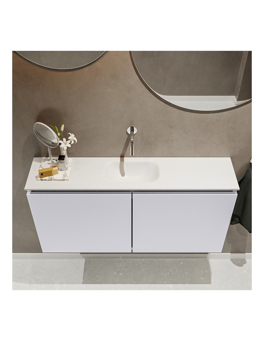 TURE Komplet badmiljø med midt centreret håndvask til vægmonteret armatur. Badmiljøet kommer med 1 dobbeltskab med 1 hylde, og er fremstillet i MDF. Håndvasken er fremstillet i talkum farvet (mat hvid) solid surface. Badmiljøet måler 100 cm i bredden. Det viste armatur medfølger ikke i sættet.