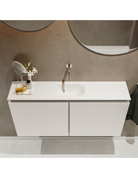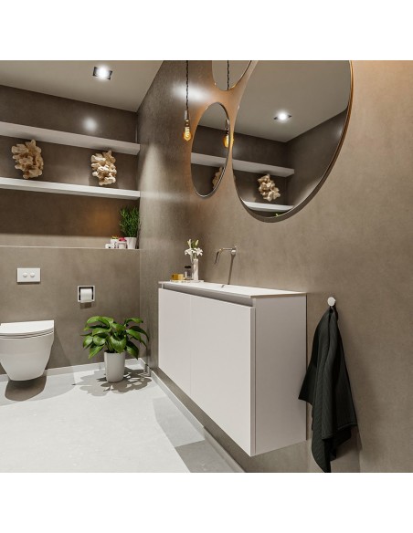TURE Komplet badmiljø med midt centreret håndvask til vægmonteret armatur. Badmiljøet kommer med 1 dobbeltskab med 1 hylde, og er fremstillet i MDF. Håndvasken er fremstillet i talkum farvet (mat hvid) solid surface. Badmiljøet måler 100 cm i bredden. Det viste armatur medfølger ikke i sættet.