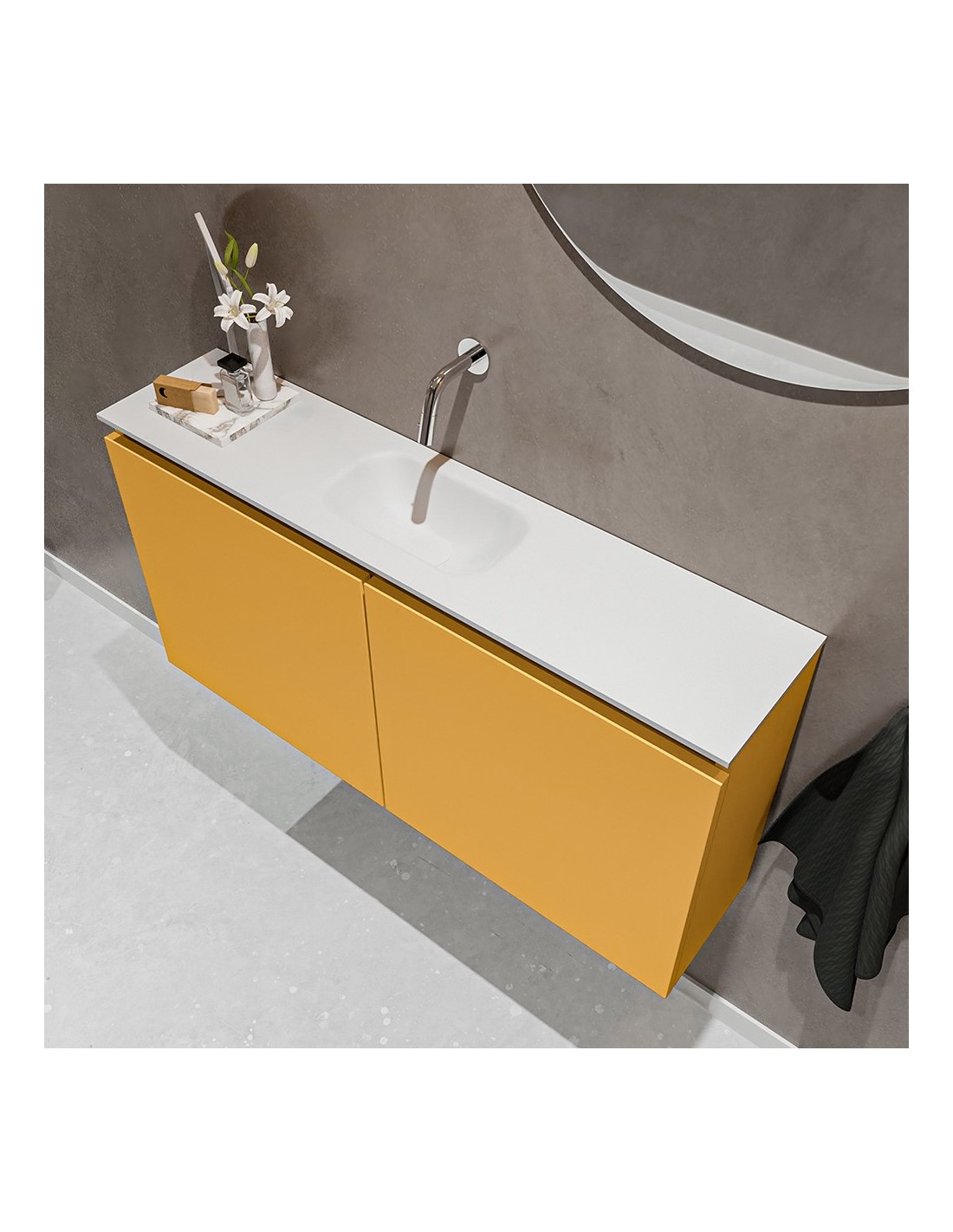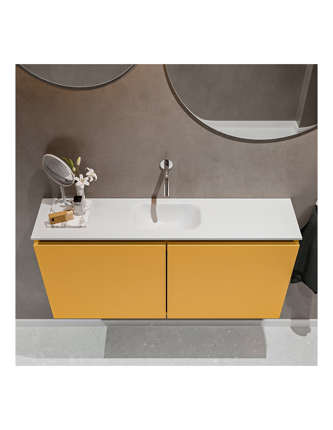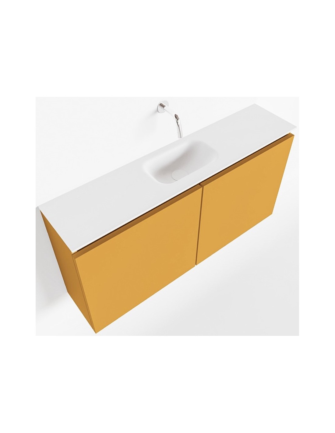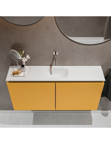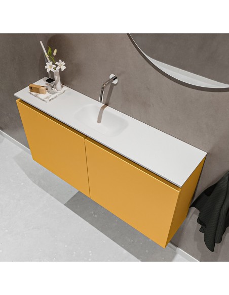 TURE Komplet badmiljø med midt centreret håndvask til vægmonteret armatur. Badmiljøet kommer med 1 dobbeltskab med 1 hylde, og er fremstillet i MDF. Håndvasken er fremstillet i talkum farvet (mat hvid) solid surface. Badmiljøet måler 100 cm i bredden. Det viste armatur medfølger ikke i sættet.