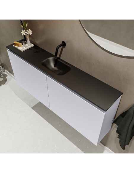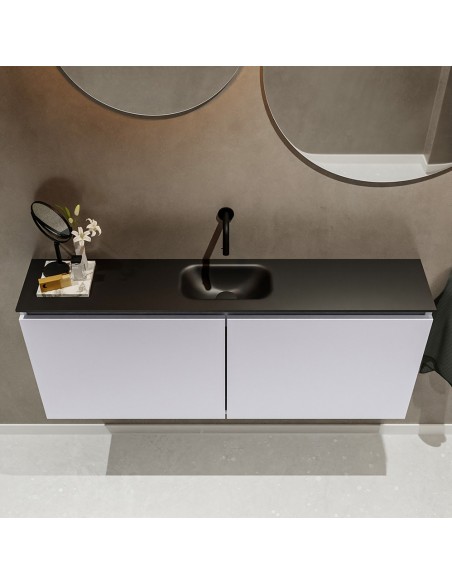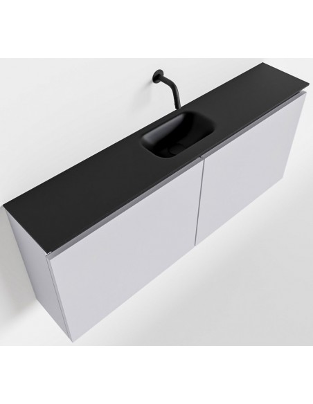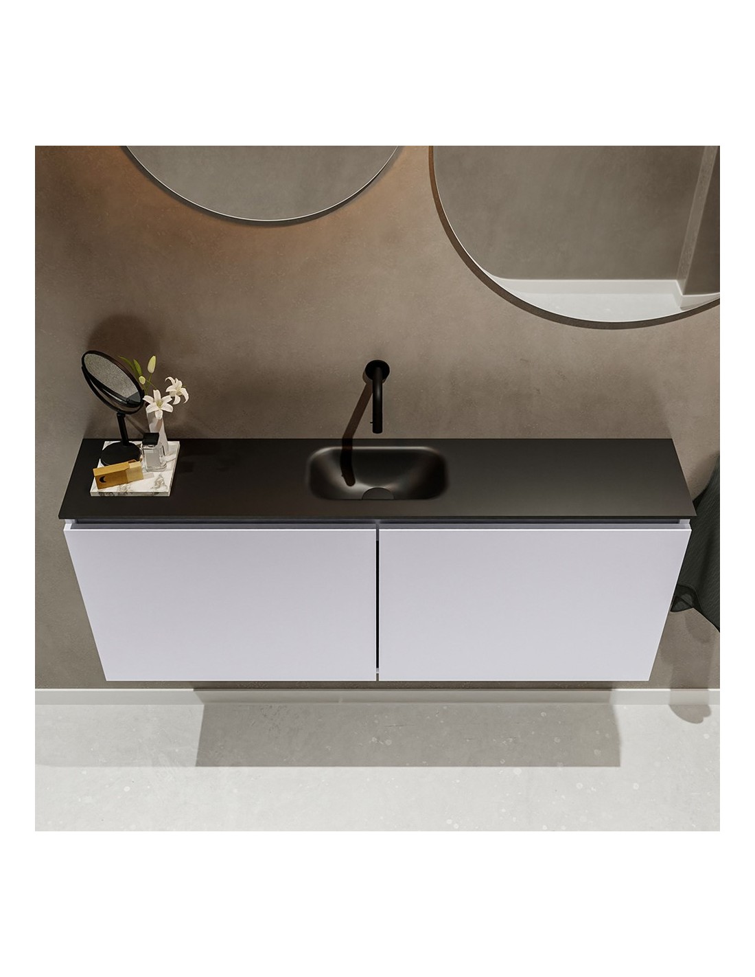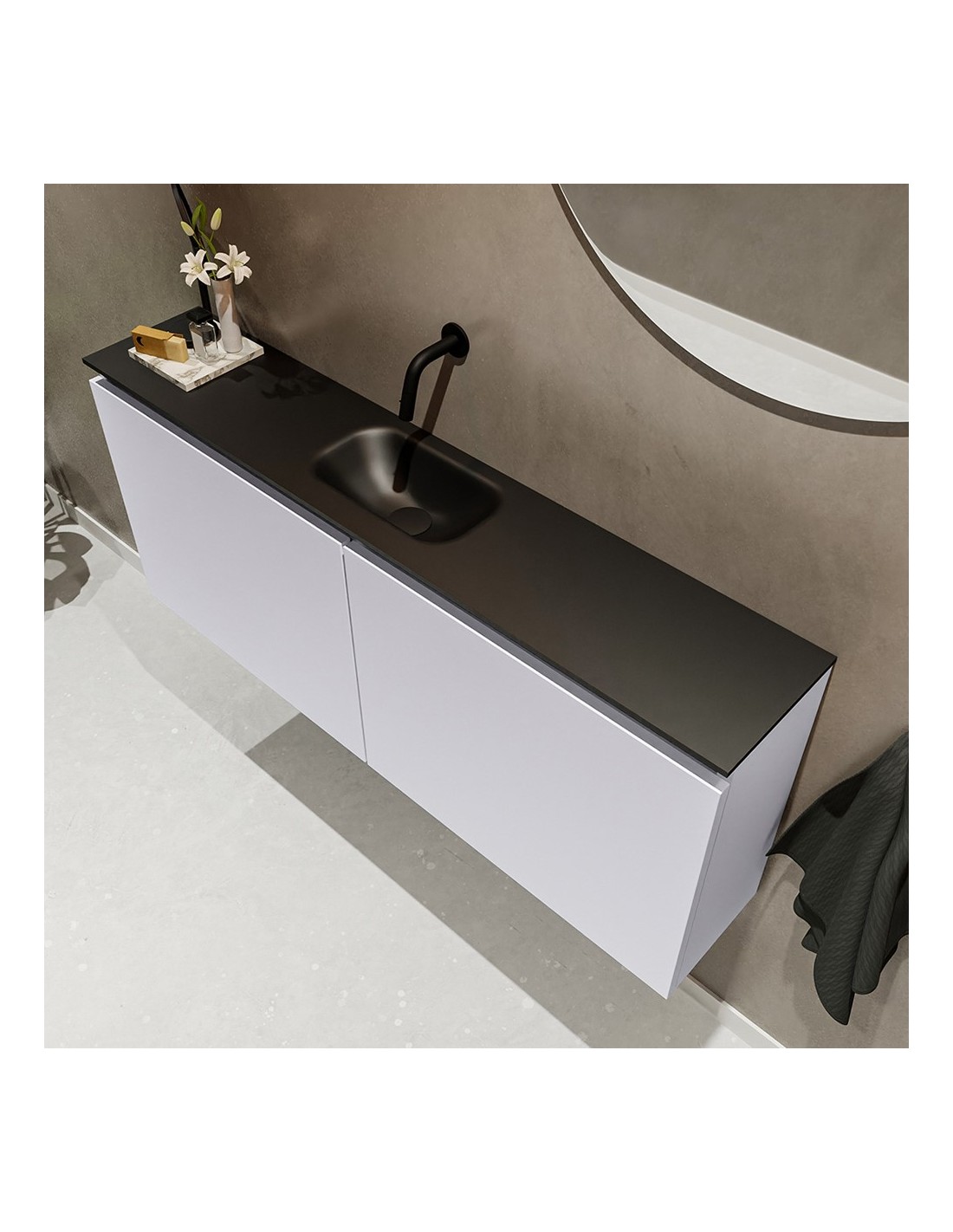 TURE Komplet badmiljø med midt centreret håndvask til vægmonteret armatur. Badmiljøet kommer med 1 dobbeltskab med 1 hylde, og er fremstillet i MDF. Håndvasken er fremstillet i sort solid surface. Badmiljøet måler 120 cm i bredden. Det viste armatur medfølger ikke i sættet.