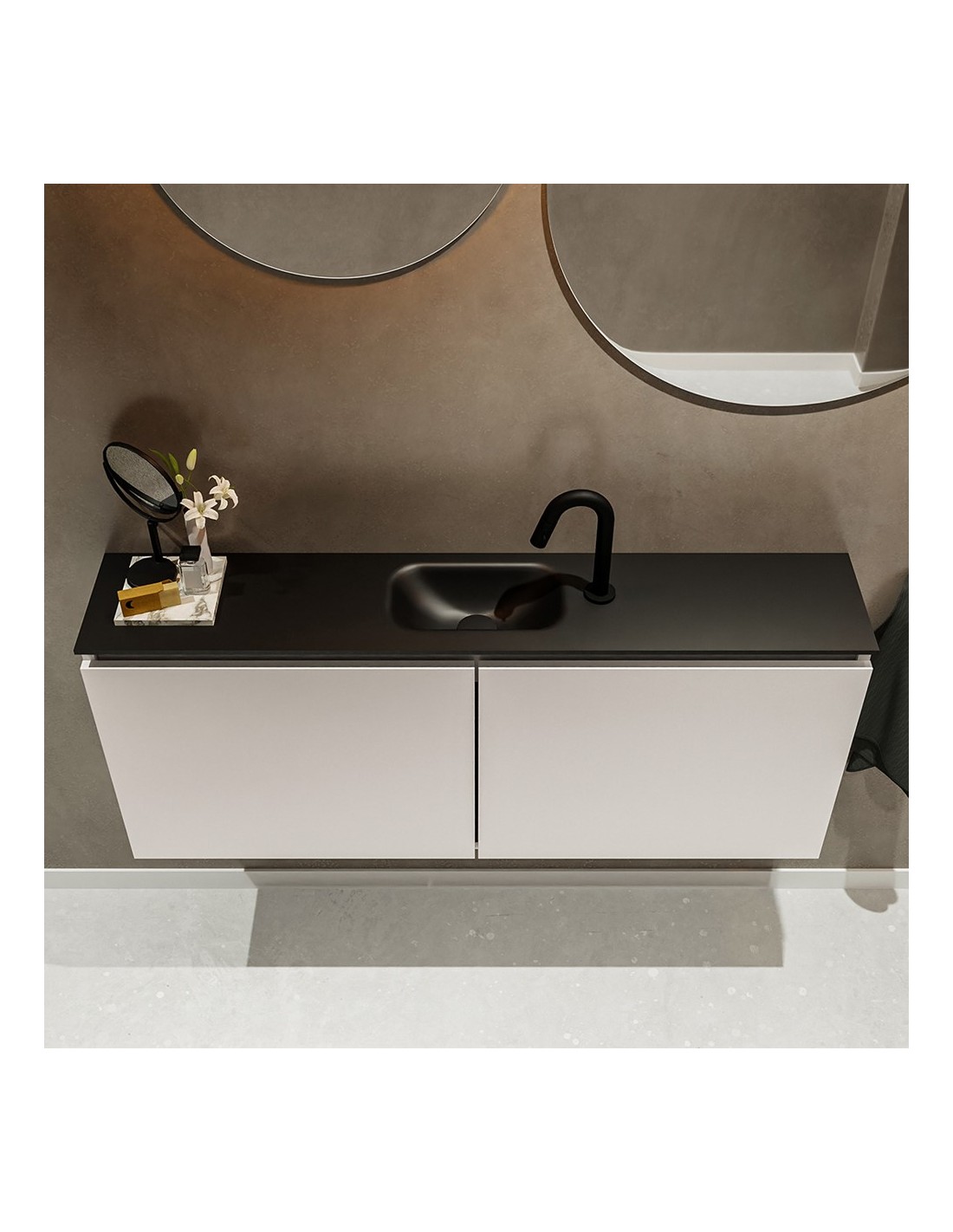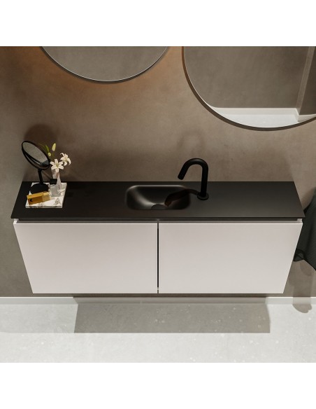 TURE Komplet badmiljø med midt centreret håndvask til bordmonteret armatur. Badmiljøet kommer med 1 dobbeltskab med 1 hylde, og er fremstillet i MDF. Håndvasken er fremstillet i sort solid surface. Badmiljøet måler 120 cm i bredden. Det viste armatur medfølger ikke i sættet.