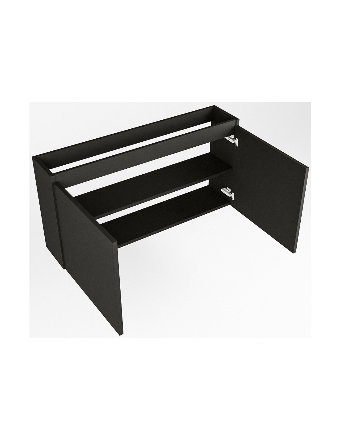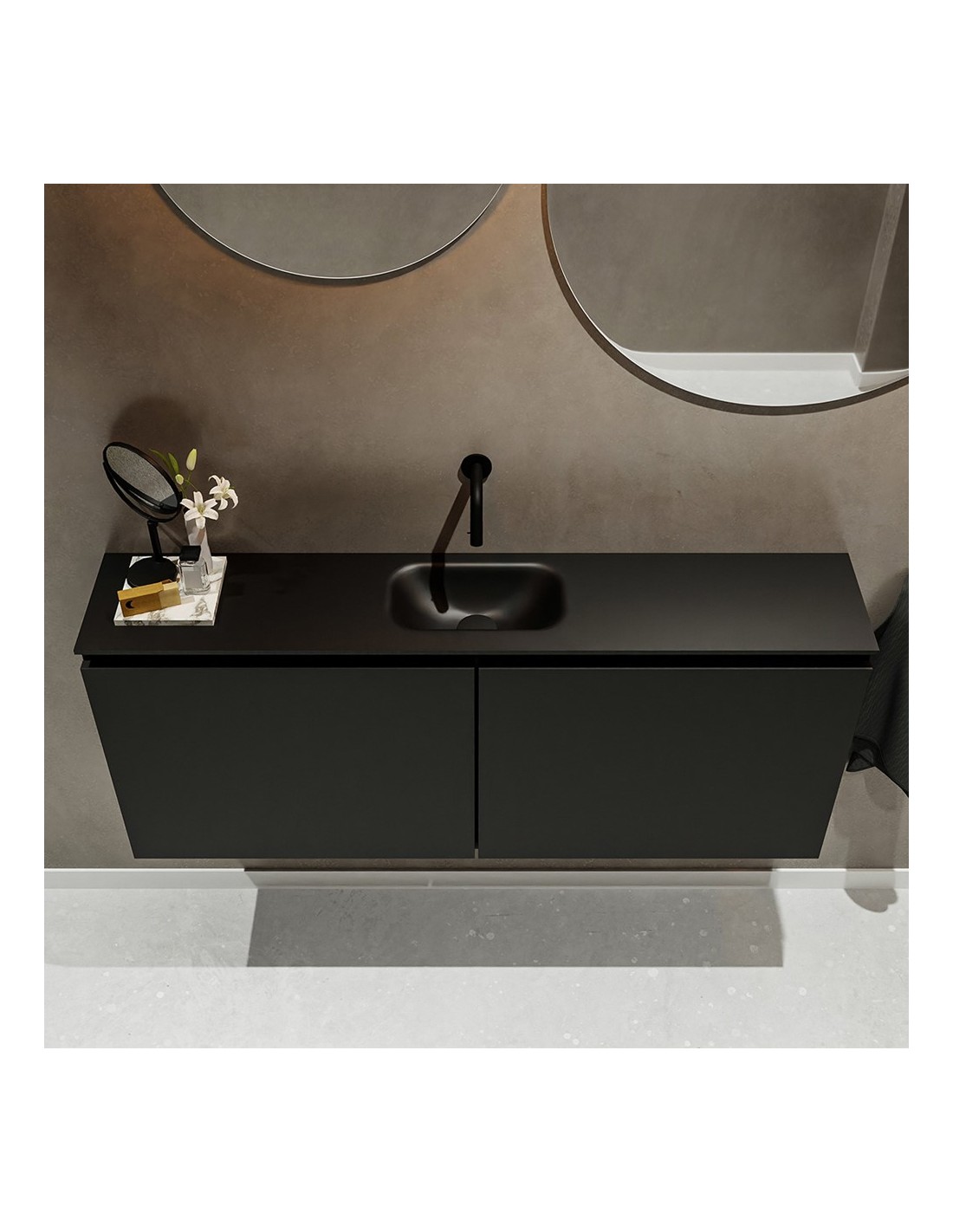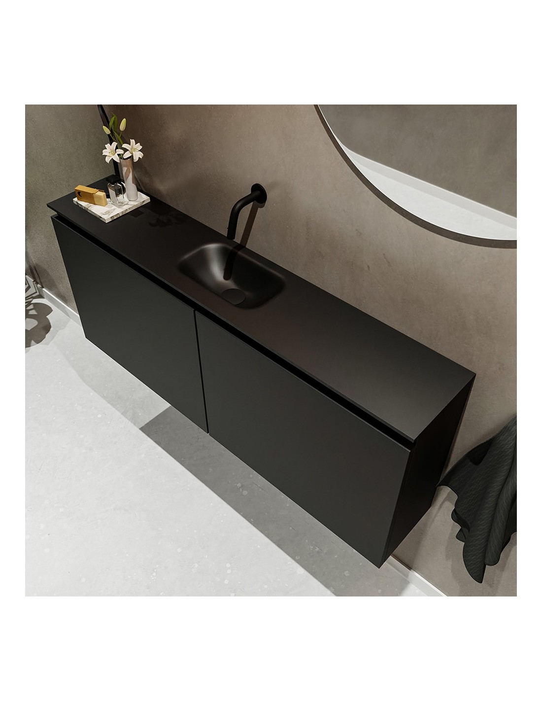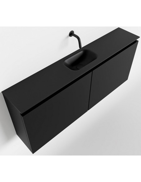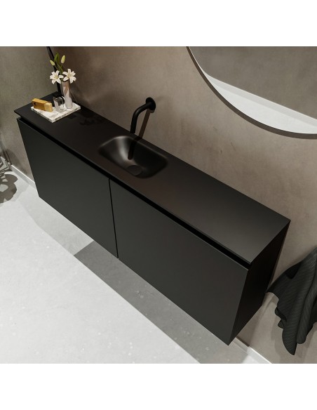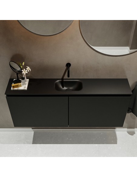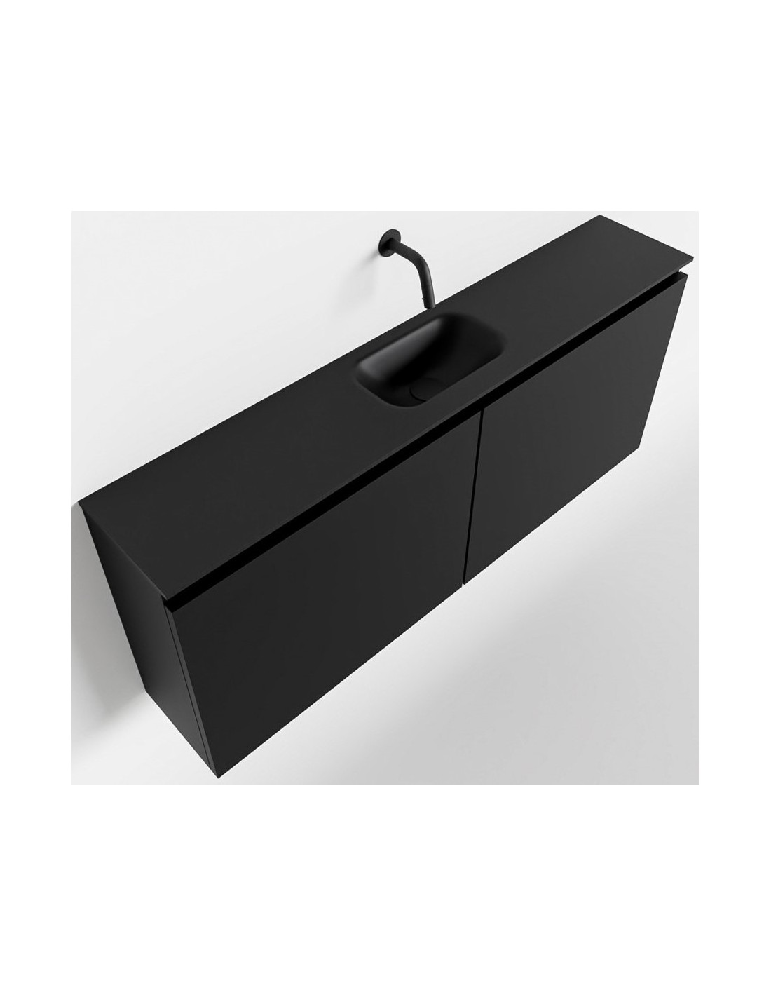 TURE Komplet badmiljø med midt centreret håndvask til vægmonteret armatur. Badmiljøet kommer med 1 dobbeltskab med 1 hylde, og er fremstillet i MDF. Håndvasken er fremstillet i sort solid surface. Badmiljøet måler 120 cm i bredden. Det viste armatur medfølger ikke i sættet.