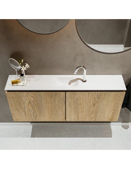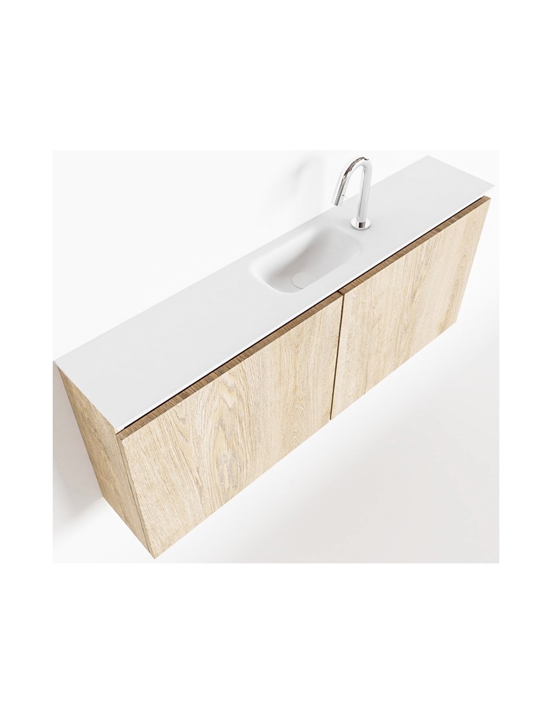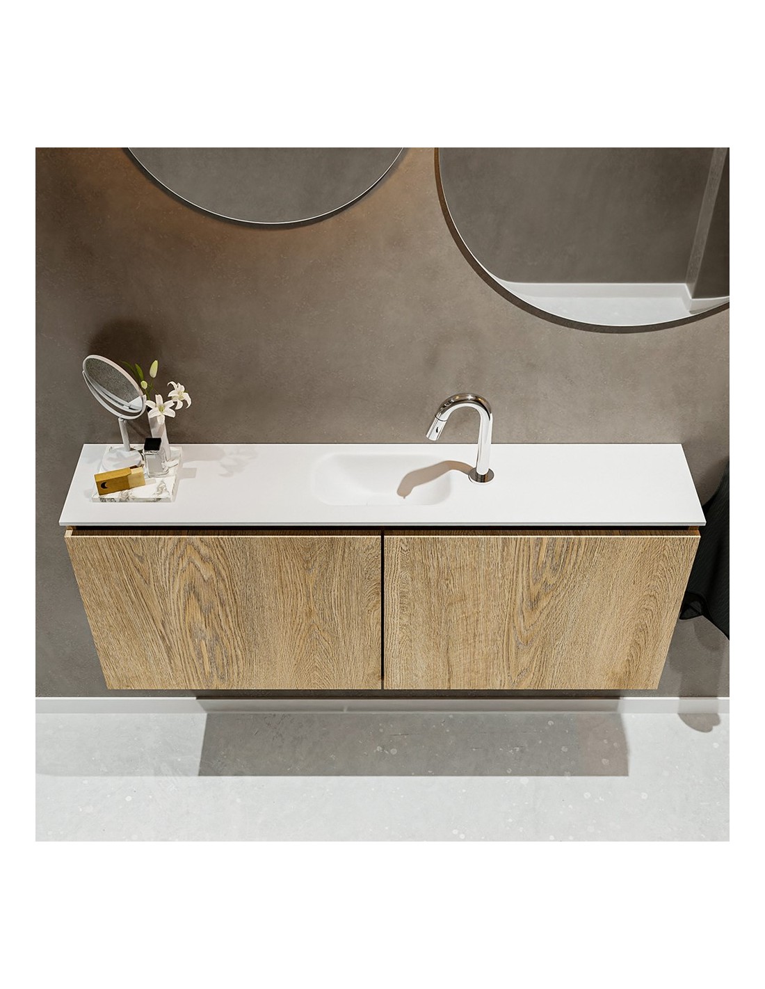 TURE Komplet badmiljø med midt centreret håndvask til bordmonteret armatur. Badmiljøet kommer med 1 dobbeltskab med 1 hylde, og er fremstillet i MDF med design af vasket eg. Håndvasken er fremstillet i talkum farvet (mat hvid) solid surface. Badmiljøet måler 120 cm i bredden. Det viste armatur medfølger ikke i sættet.