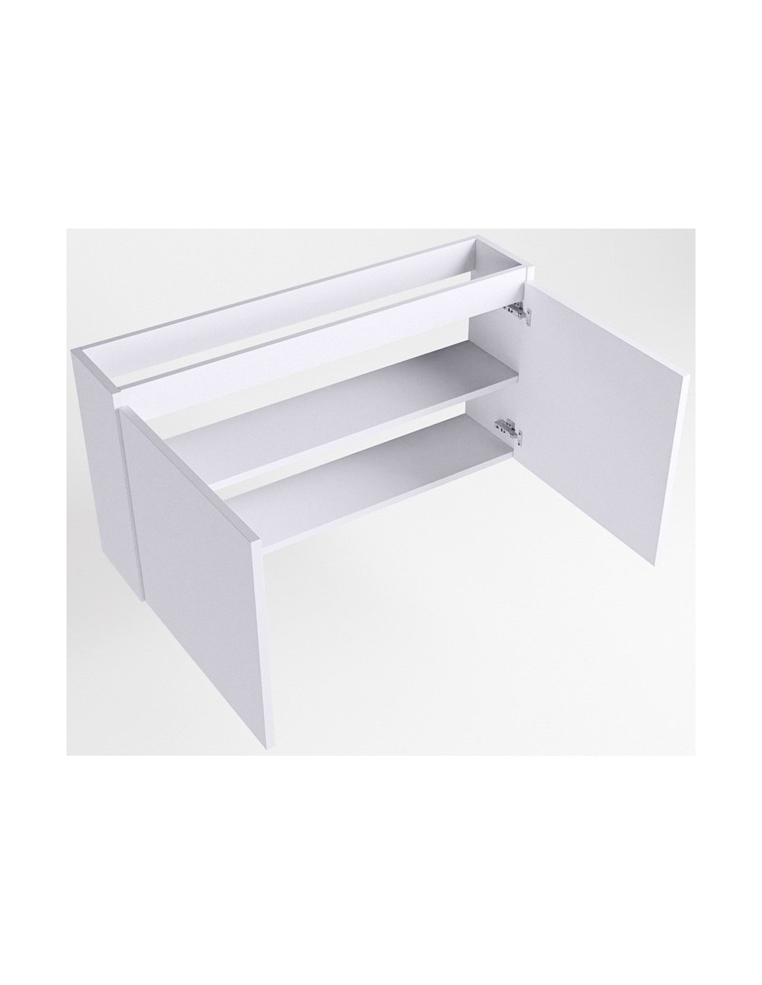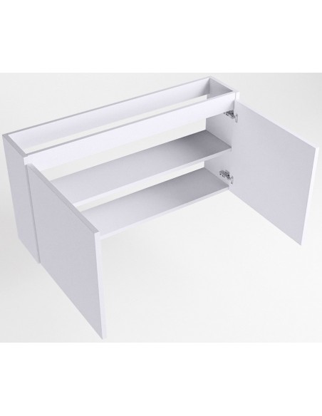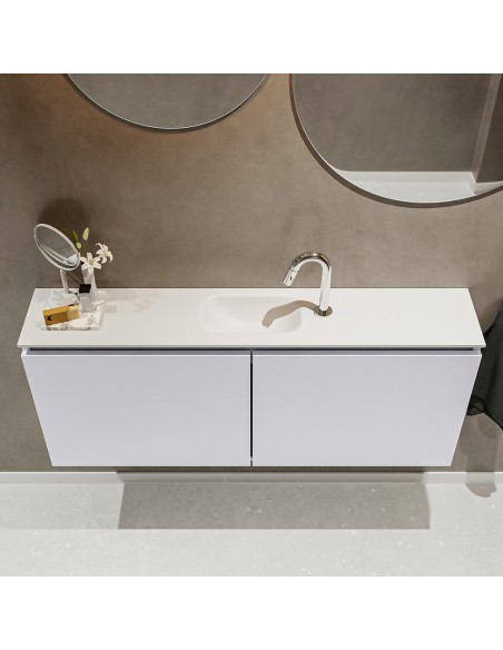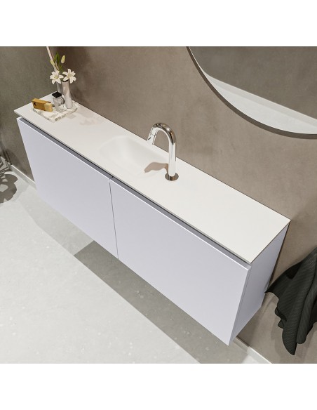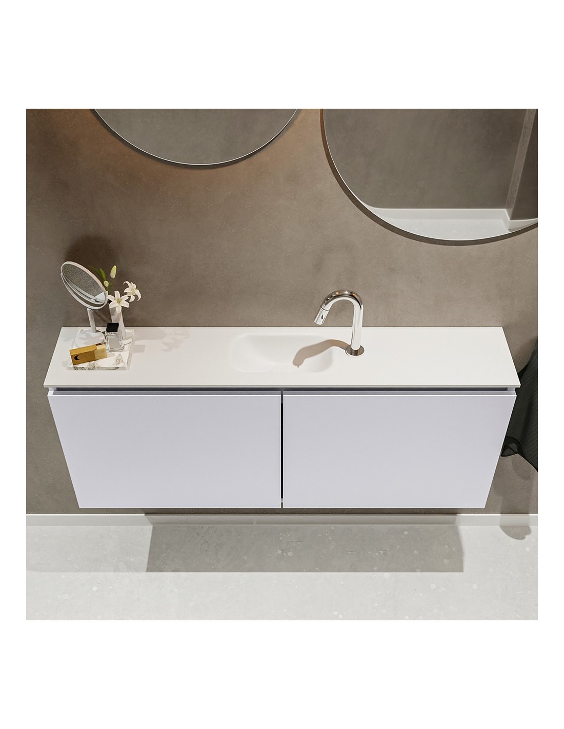 TURE Komplet badmiljø med midt centreret håndvask til bordmonteret armatur. Badmiljøet kommer med 1 dobbeltskab med 1 hylde, og er fremstillet i MDF. Håndvasken er fremstillet i talkum farvet (mat hvid) solid surface. Badmiljøet måler 120 cm i bredden. Det viste armatur medfølger ikke i sættet.