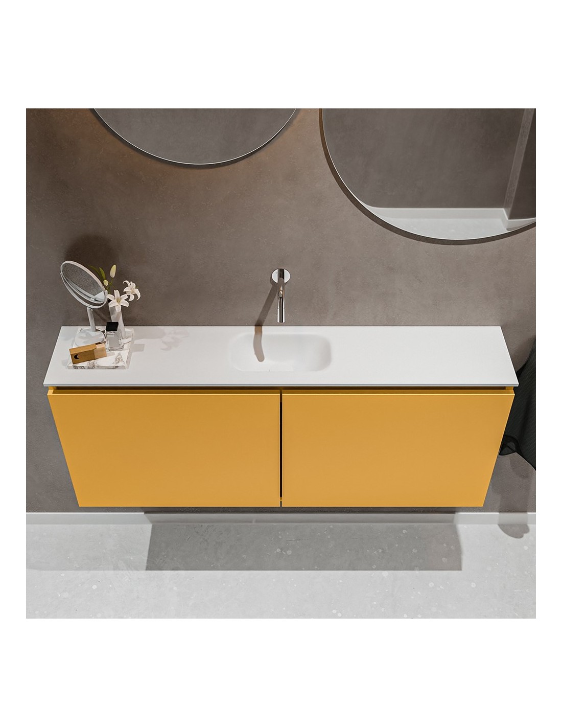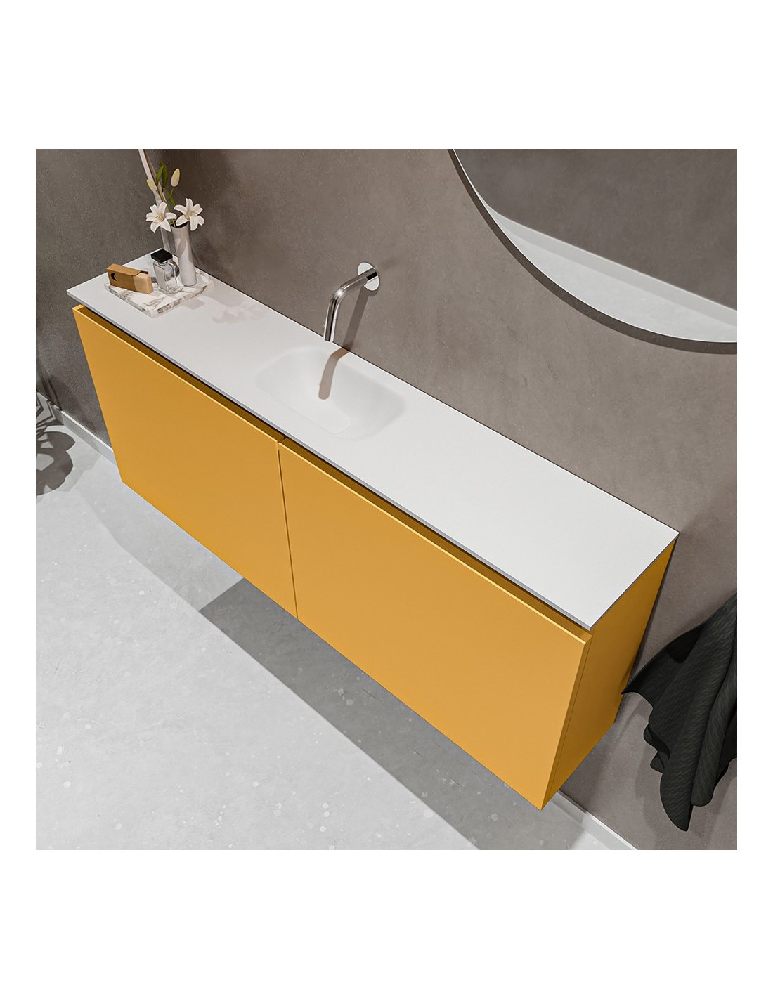 TURE Komplet badmiljø med midt centreret håndvask til vægmonteret armatur. Badmiljøet kommer med 1 dobbeltskab med 1 hylde, og er fremstillet i MDF. Håndvasken er fremstillet i talkum farvet (mat hvid) solid surface. Badmiljøet måler 120 cm i bredden. Det viste armatur medfølger ikke i sættet.