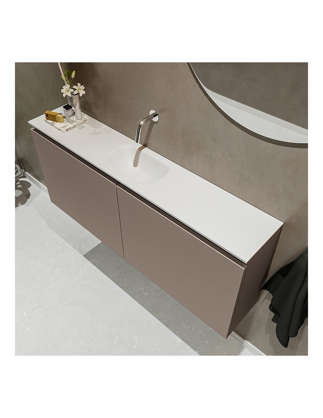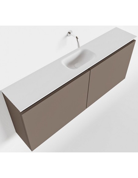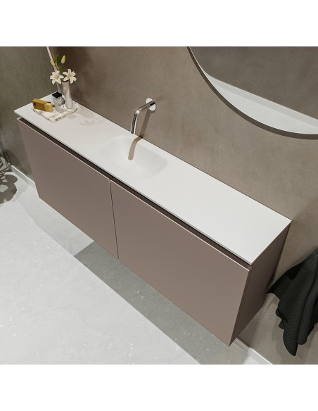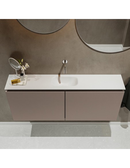 TURE Komplet badmiljø med midt centreret håndvask til vægmonteret armatur. Badmiljøet kommer med 1 dobbeltskab med 1 hylde, og er fremstillet i MDF. Håndvasken er fremstillet i talkum farvet (mat hvid) solid surface. Badmiljøet måler 120 cm i bredden. Det viste armatur medfølger ikke i sættet.