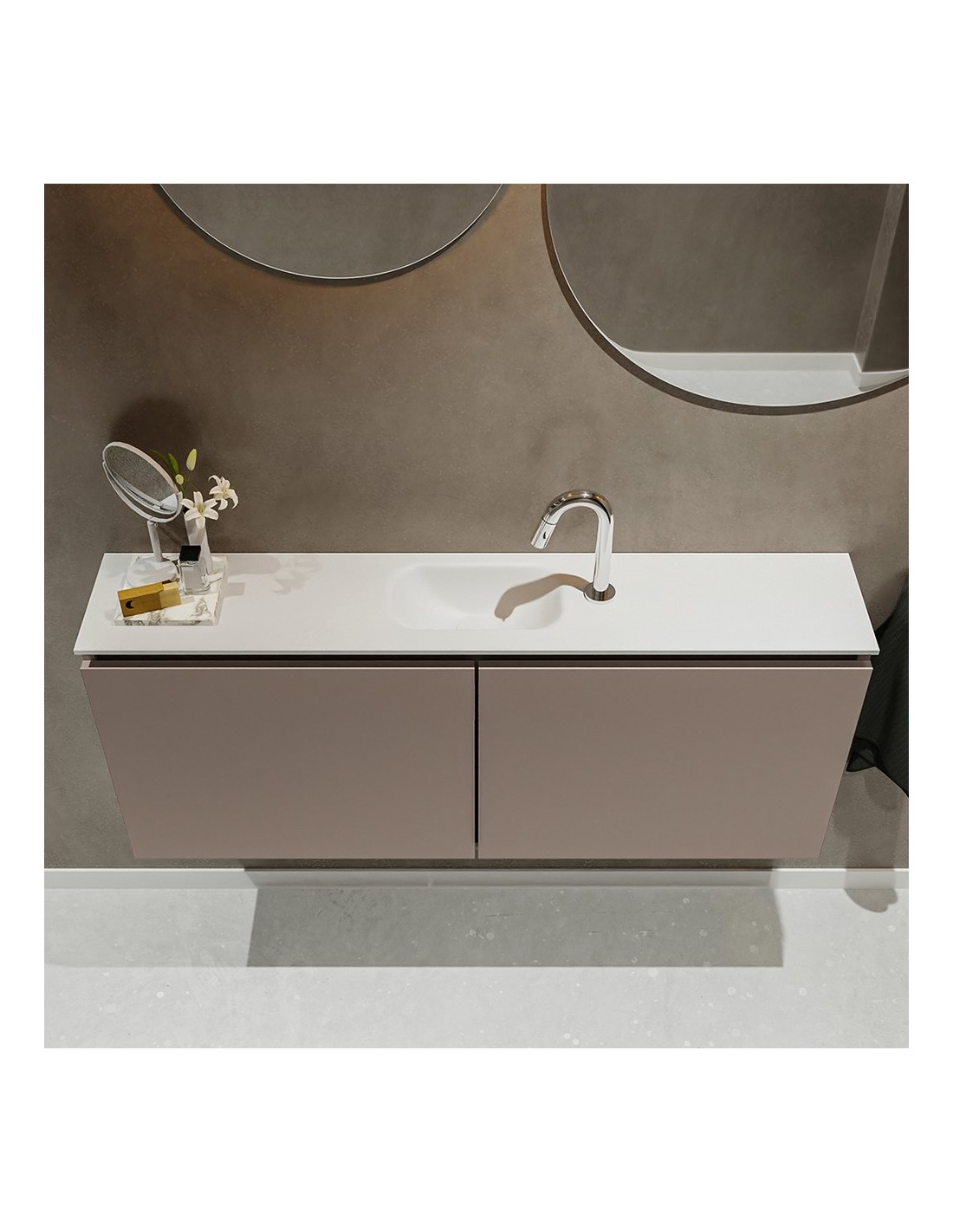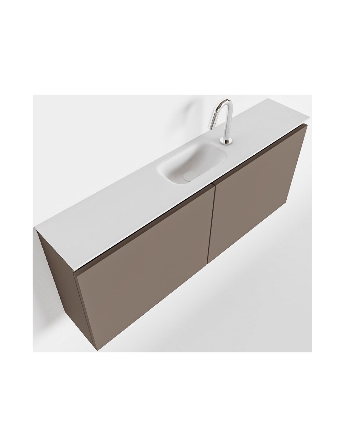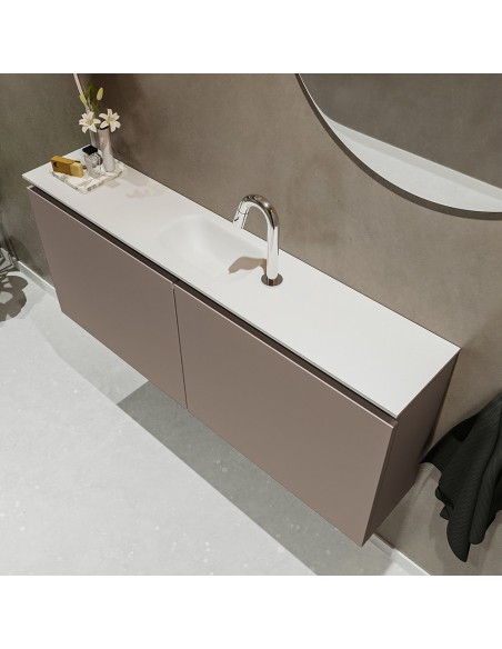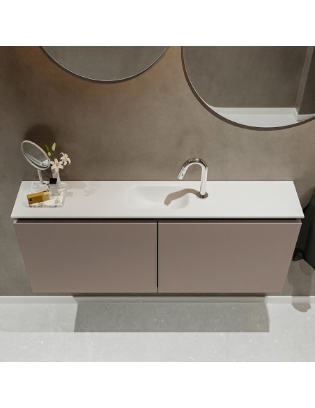 TURE Komplet badmiljø med midt centreret håndvask til bordmonteret armatur. Badmiljøet kommer med 1 dobbeltskab med 1 hylde, og er fremstillet i MDF. Håndvasken er fremstillet i talkum farvet (mat hvid) solid surface. Badmiljøet måler 120 cm i bredden. Det viste armatur medfølger ikke i sættet.