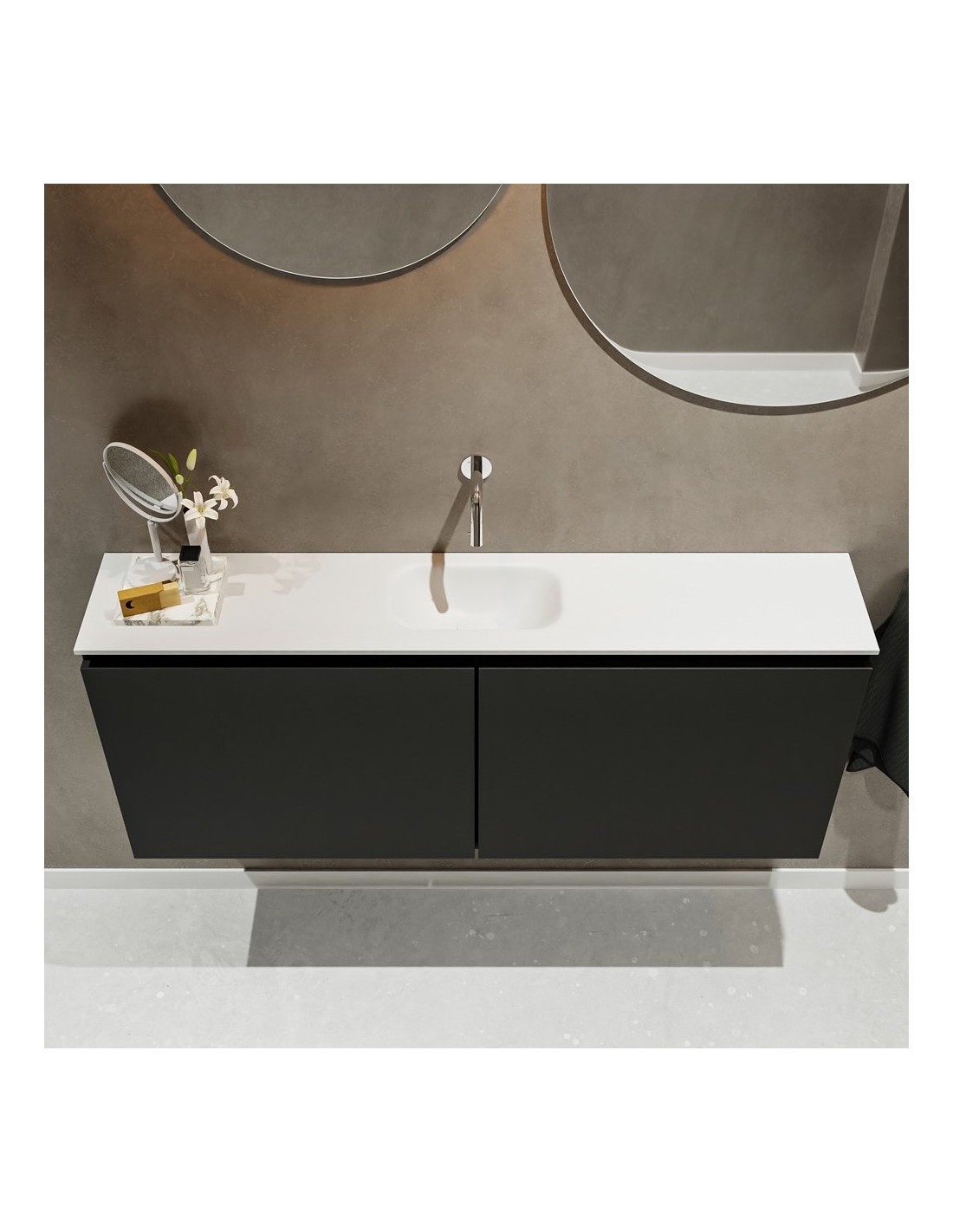 TURE Komplet badmiljø med midt centreret håndvask til vægmonteret armatur. Badmiljøet kommer med 1 dobbeltskab med 1 hylde, og er fremstillet i MDF. Håndvasken er fremstillet i talkum farvet (mat hvid) solid surface. Badmiljøet måler 120 cm i bredden. Det viste armatur medfølger ikke i sættet.