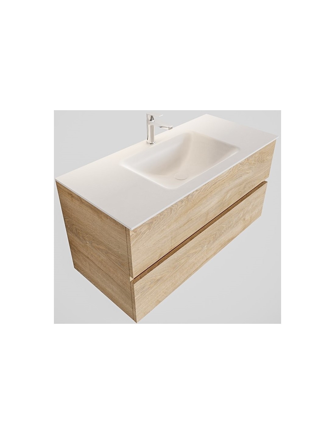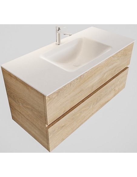 VICA Komplet badmiljø med midt centreret håndvask til bordmonteret armatur. Badmiljøet kommer med 2 skuffer med fuldt udtræk, og er fremstillet i MDF med design af vasket eg. Håndvasken er fremstillet i talkum farvet (mat hvid) solid surface. Badmiljøet måler 100 cm i bredden. Det viste armatur medfølger ikke i sættet.