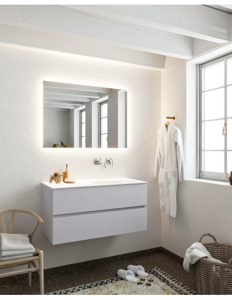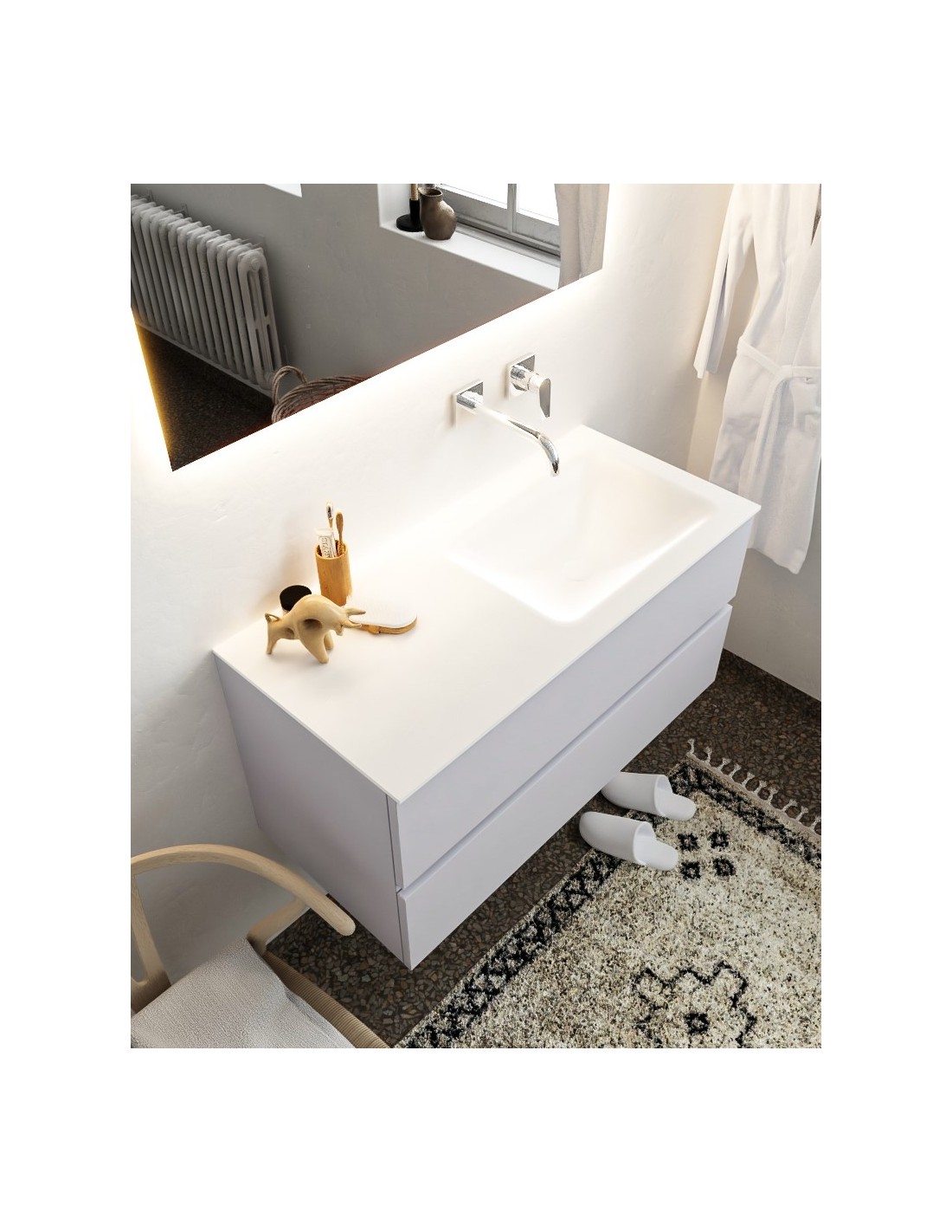 VICA Komplet badmiljø med højrevendt håndvask til vægmonteret armatur. Badmiljøet kommer med 2 skuffer med fuldt udtræk, og er fremstillet i MDF. Håndvasken er fremstillet i talkum farvet (mat hvid) solid surface. Badmiljøet måler 100 cm i bredden. Det viste armatur medfølger ikke i sættet.