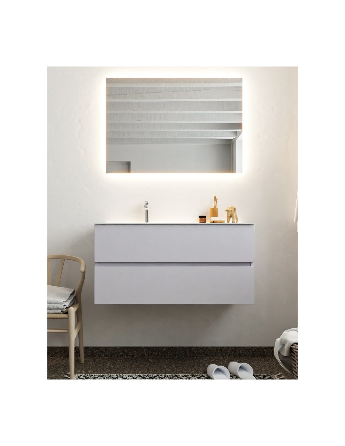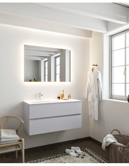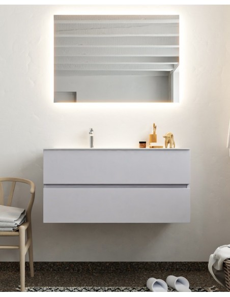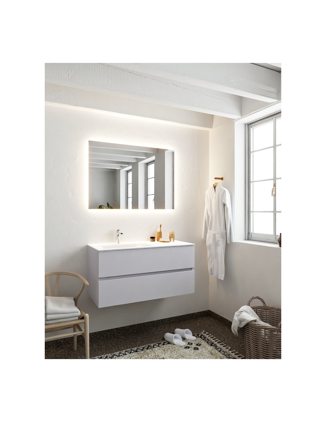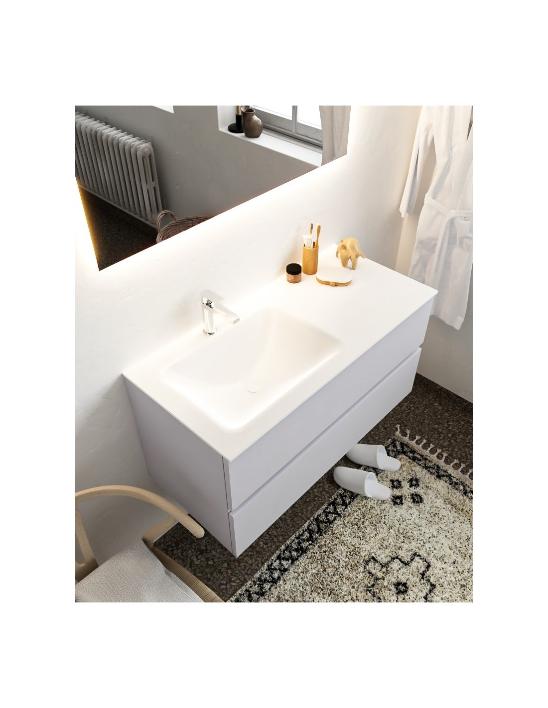 VICA Komplet badmiljø med venstrevendt håndvask til bordmonteret armatur. Badmiljøet kommer med 2 skuffer med fuldt udtræk, og er fremstillet i MDF. Håndvasken er fremstillet i talkum farvet (mat hvid) solid surface. Badmiljøet måler 100 cm i bredden. Det viste armatur medfølger ikke i sættet.