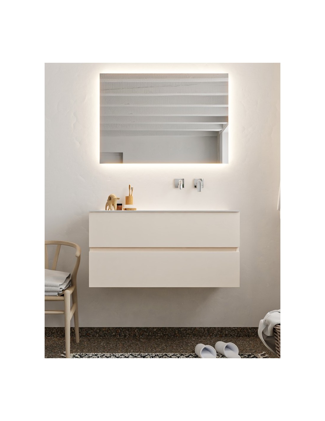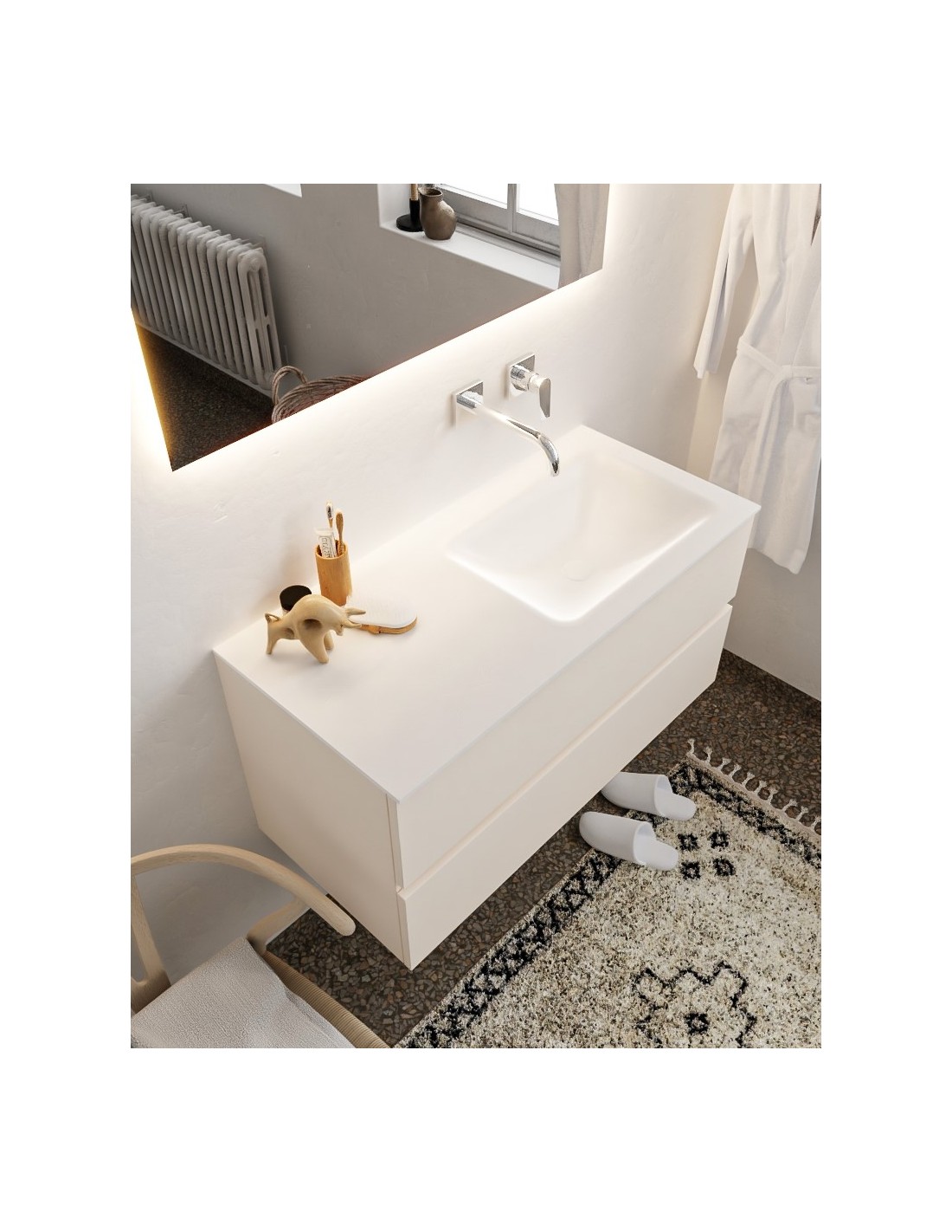 VICA Komplet badmiljø med højrevendt håndvask til vægmonteret armatur. Badmiljøet kommer med 2 skuffer med fuldt udtræk, og er fremstillet i MDF. Håndvasken er fremstillet i talkum farvet (mat hvid) solid surface. Badmiljøet måler 100 cm i bredden. Det viste armatur medfølger ikke i sættet.