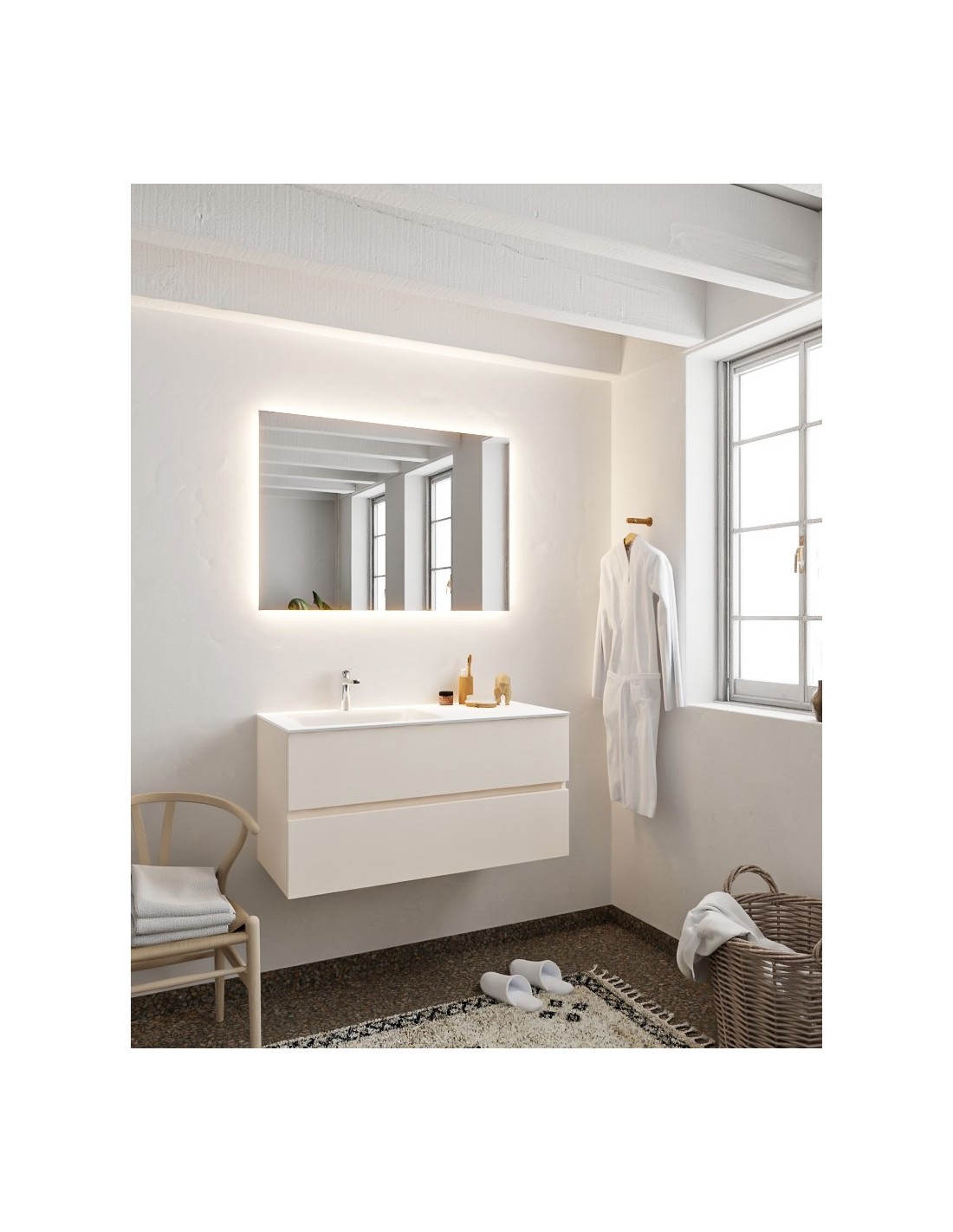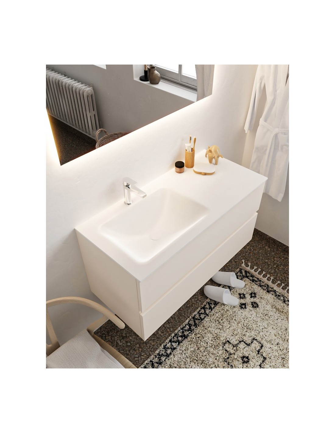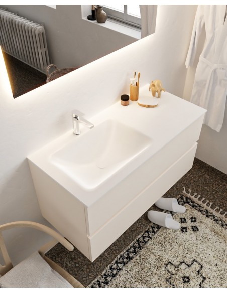 VICA Komplet badmiljø med venstrevendt håndvask til bordmonteret armatur. Badmiljøet kommer med 2 skuffer med fuldt udtræk, og er fremstillet i MDF. Håndvasken er fremstillet i talkum farvet (mat hvid) solid surface. Badmiljøet måler 100 cm i bredden. Det viste armatur medfølger ikke i sættet.