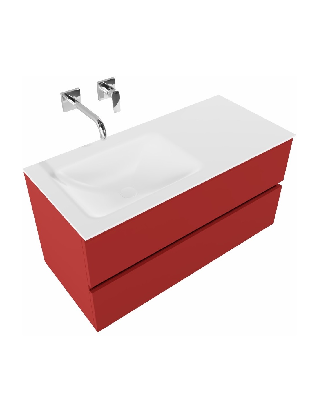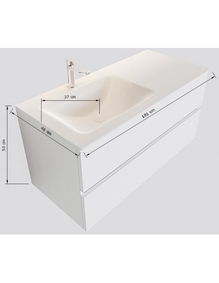 VICA Komplet badmiljø med venstrevendt håndvask til vægmonteret armatur. Badmiljøet kommer med 2 skuffer med fuldt udtræk, og er fremstillet i MDF. Håndvasken er fremstillet i talkum farvet (mat hvid) solid surface. Badmiljøet måler 100 cm i bredden. Det viste armatur medfølger ikke i sættet.