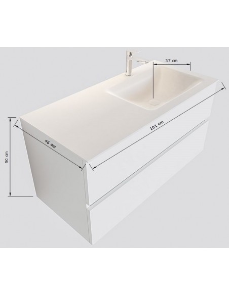 VICA Komplet badmiljø med højrevendt håndvask til vægmonteret armatur. Badmiljøet kommer med 2 skuffer med fuldt udtræk, og er fremstillet i MDF. Håndvasken er fremstillet i talkum farvet (mat hvid) solid surface. Badmiljøet måler 100 cm i bredden. Det viste armatur medfølger ikke i sættet.