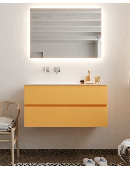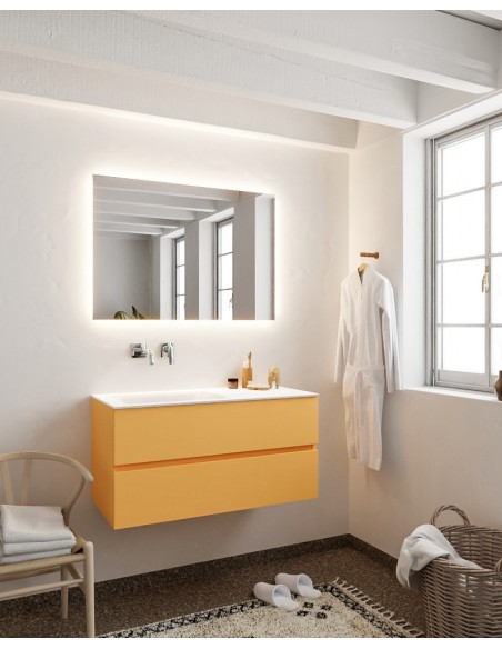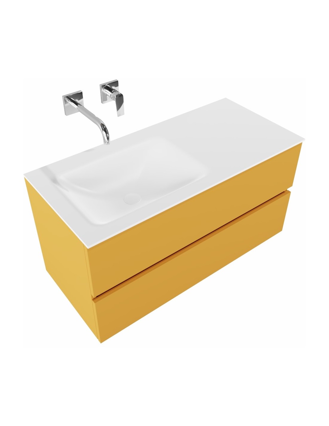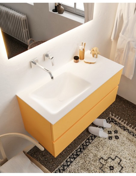 VICA Komplet badmiljø med venstrevendt håndvask til vægmonteret armatur. Badmiljøet kommer med 2 skuffer med fuldt udtræk, og er fremstillet i MDF. Håndvasken er fremstillet i talkum farvet (mat hvid) solid surface. Badmiljøet måler 100 cm i bredden. Det viste armatur medfølger ikke i sættet.
