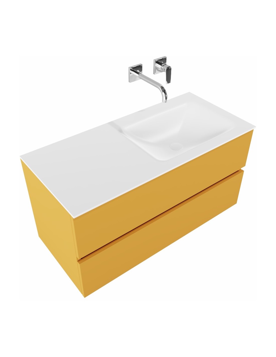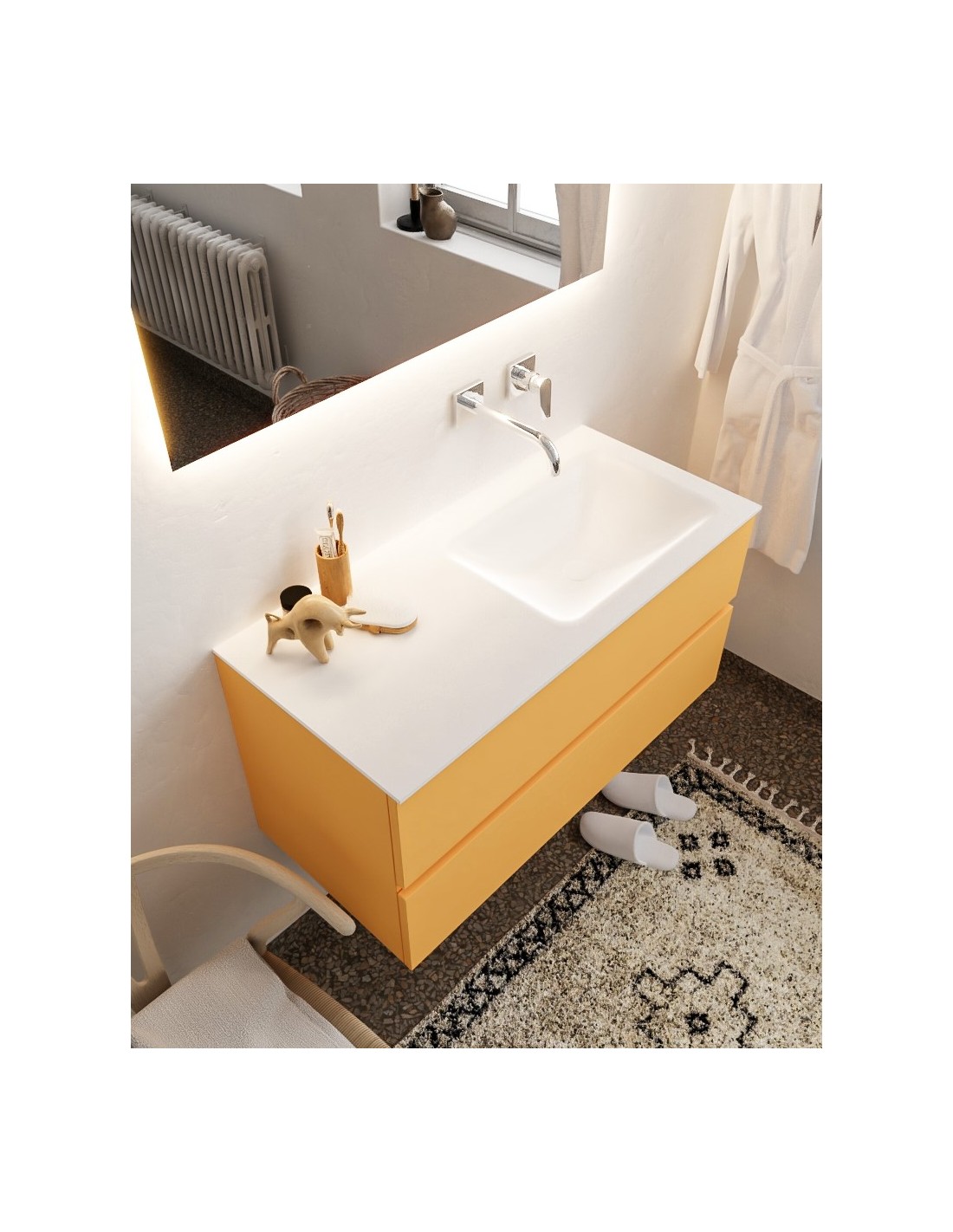 VICA Komplet badmiljø med højrevendt håndvask til vægmonteret armatur. Badmiljøet kommer med 2 skuffer med fuldt udtræk, og er fremstillet i MDF. Håndvasken er fremstillet i talkum farvet (mat hvid) solid surface. Badmiljøet måler 100 cm i bredden. Det viste armatur medfølger ikke i sættet.
