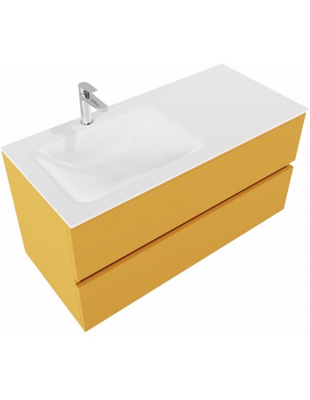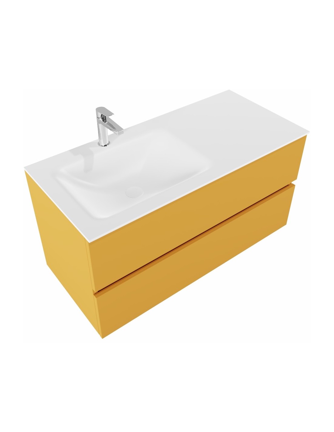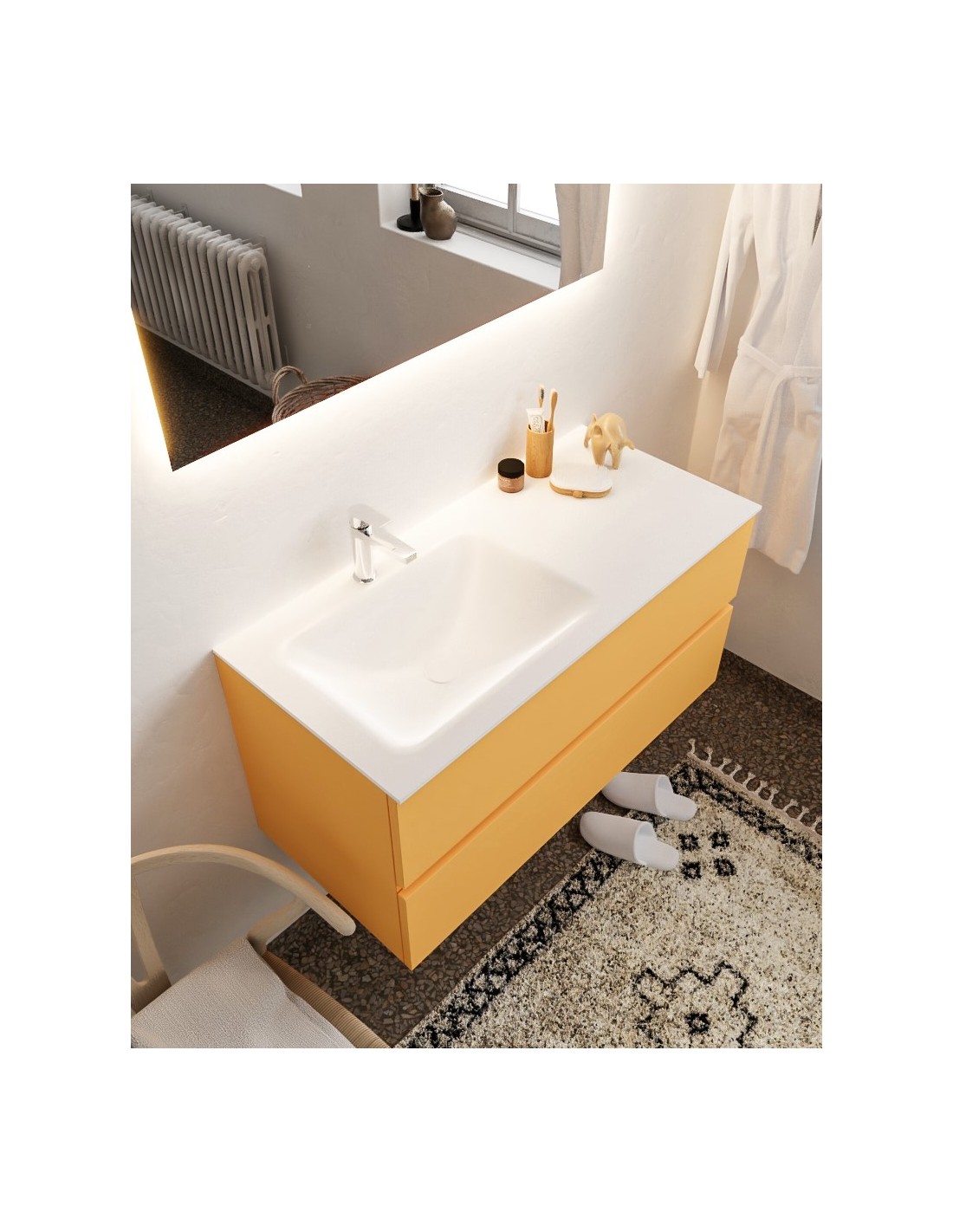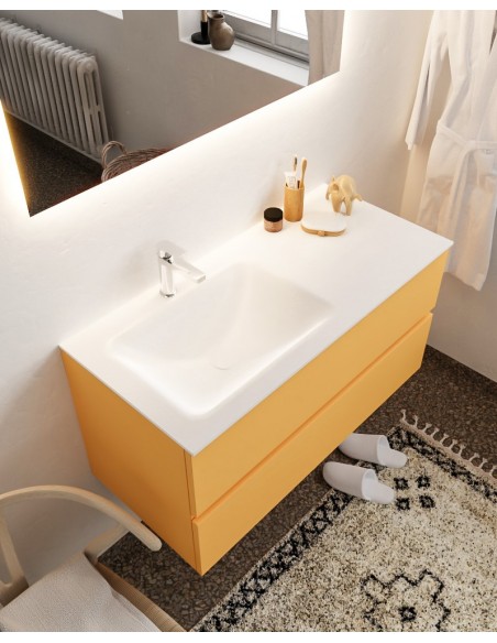 VICA Komplet badmiljø med venstrevendt håndvask til bordmonteret armatur. Badmiljøet kommer med 2 skuffer med fuldt udtræk, og er fremstillet i MDF. Håndvasken er fremstillet i talkum farvet (mat hvid) solid surface. Badmiljøet måler 100 cm i bredden. Det viste armatur medfølger ikke i sættet.