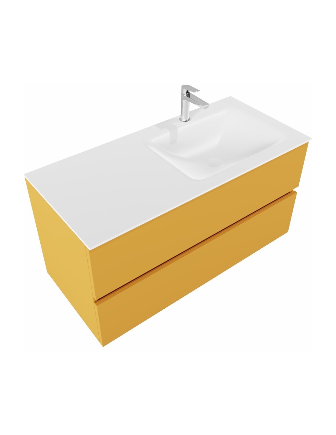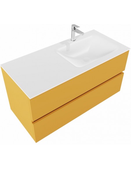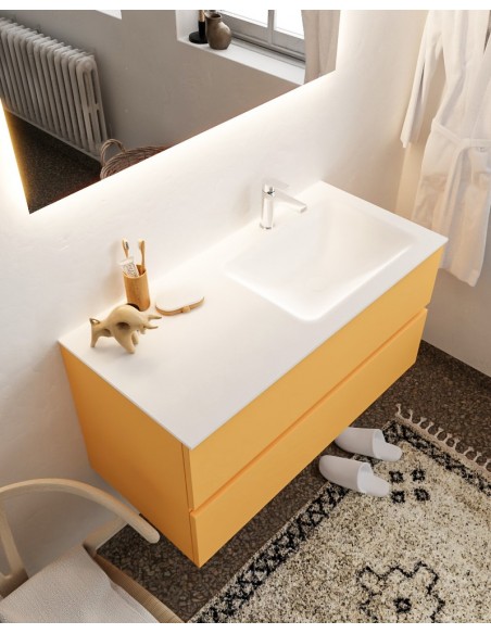 VICA Komplet badmiljø med højrevendt håndvask til bordmonteret armatur. Badmiljøet kommer med 2 skuffer med fuldt udtræk, og er fremstillet i MDF. Håndvasken er fremstillet i talkum farvet (mat hvid) solid surface. Badmiljøet måler 100 cm i bredden. Det viste armatur medfølger ikke i sættet.
