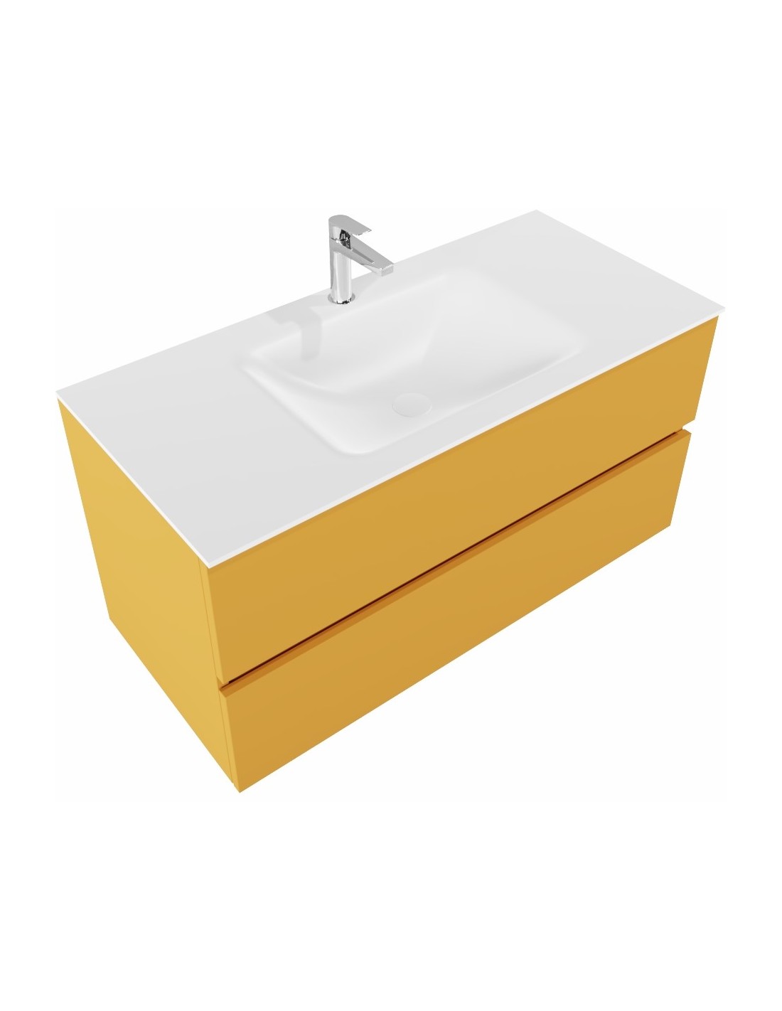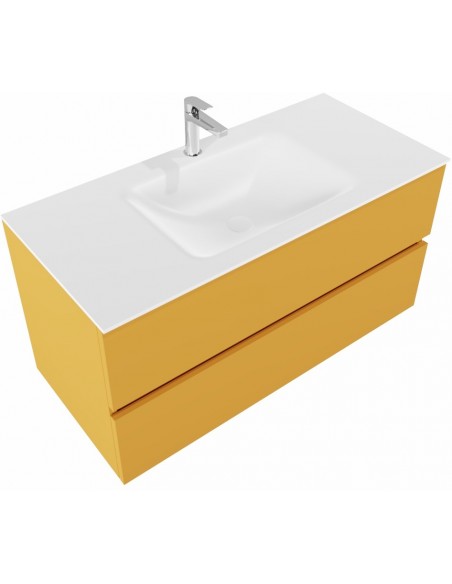 VICA Komplet badmiljø med midt centreret håndvask til bordmonteret armatur. Badmiljøet kommer med 2 skuffer med fuldt udtræk, og er fremstillet i MDF. Håndvasken er fremstillet i talkum farvet (mat hvid) solid surface. Badmiljøet måler 100 cm i bredden. Det viste armatur medfølger ikke i sættet.