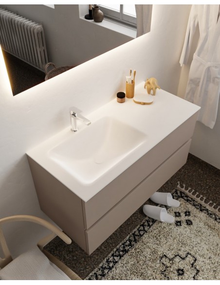 VICA Komplet badmiljø med venstrevendt håndvask til bordmonteret armatur. Badmiljøet kommer med 2 skuffer med fuldt udtræk, og er fremstillet i MDF. Håndvasken er fremstillet i talkum farvet (mat hvid) solid surface. Badmiljøet måler 100 cm i bredden. Det viste armatur medfølger ikke i sættet.