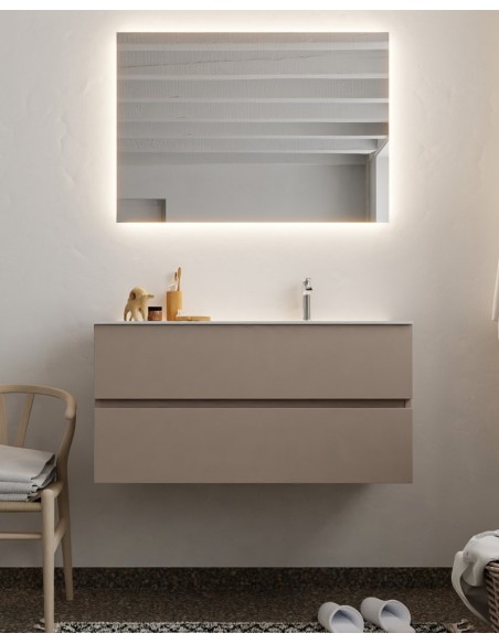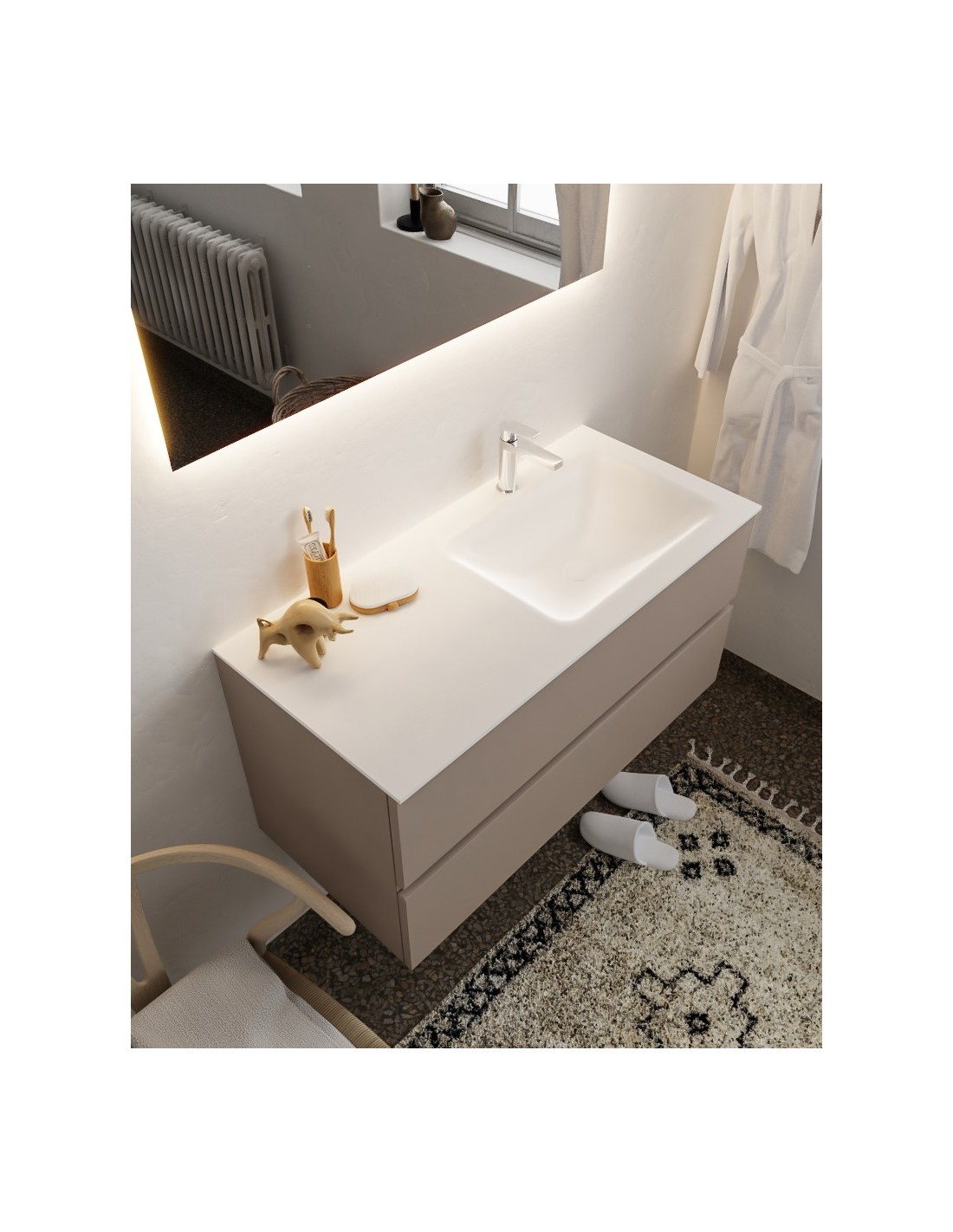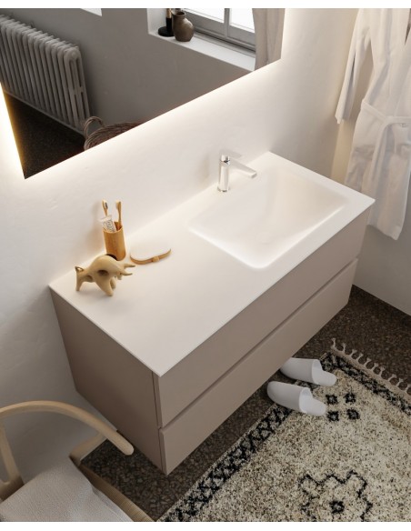 VICA Komplet badmiljø med højrevendt håndvask til bordmonteret armatur. Badmiljøet kommer med 2 skuffer med fuldt udtræk, og er fremstillet i MDF. Håndvasken er fremstillet i talkum farvet (mat hvid) solid surface. Badmiljøet måler 100 cm i bredden. Det viste armatur medfølger ikke i sættet.