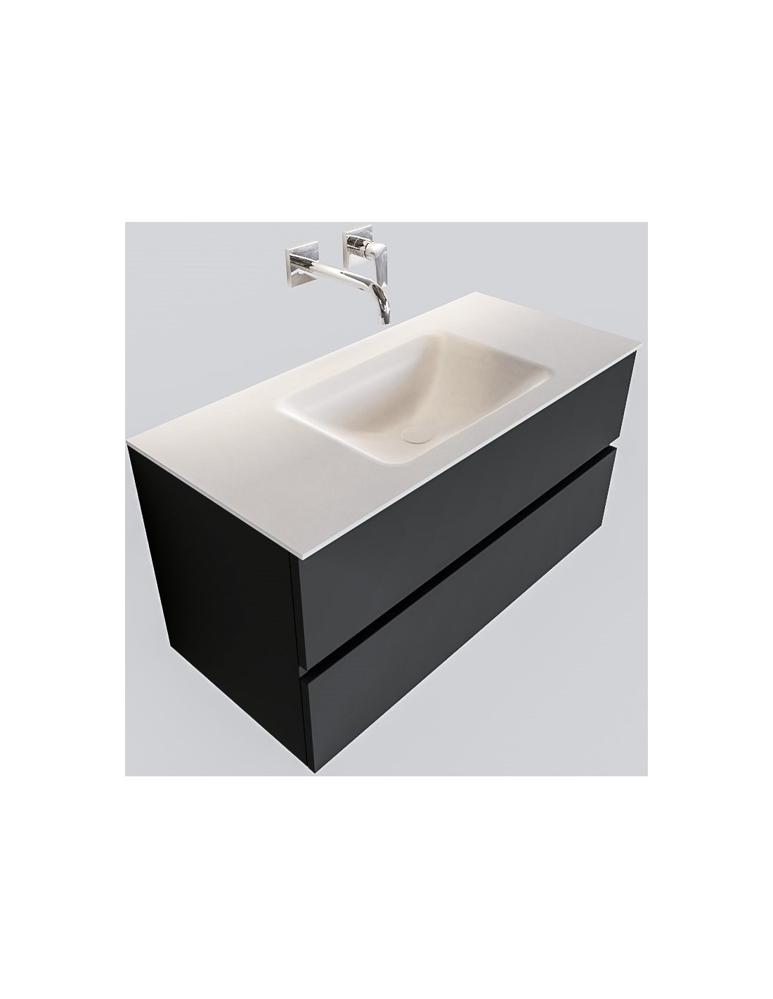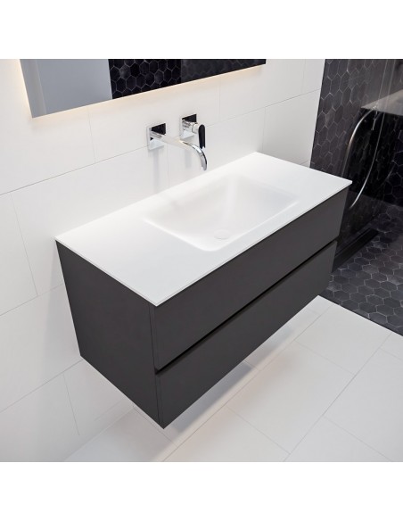 VICA Komplet badmiljø med midt centreret håndvask til vægmonteret armatur. Badmiljøet kommer med 2 skuffer med fuldt udtræk, og er fremstillet i MDF. Håndvasken er fremstillet i talkum farvet (mat hvid) solid surface. Badmiljøet måler 100 cm i bredden. Det viste armatur medfølger ikke i sættet.