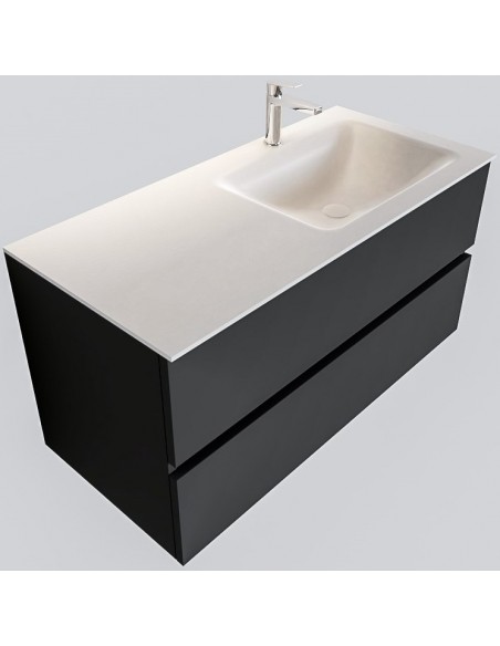 VICA Komplet badmiljø med højrevendt håndvask til bordmonteret armatur. Badmiljøet kommer med 2 skuffer med fuldt udtræk, og er fremstillet i MDF. Håndvasken er fremstillet i talkum farvet (mat hvid) solid surface. Badmiljøet måler 100 cm i bredden. Det viste armatur medfølger ikke i sættet.